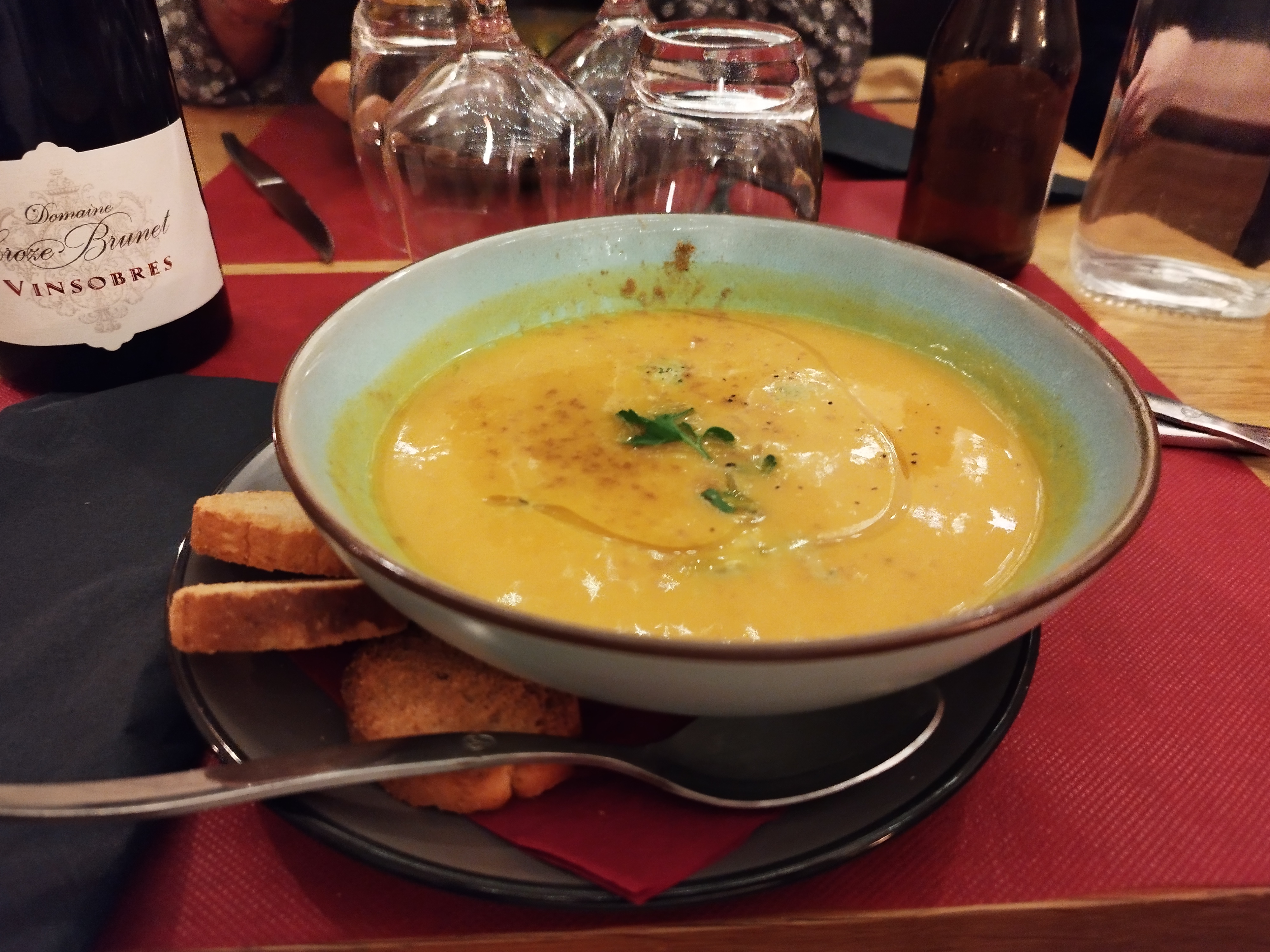 Je n'ai pas aimé du tout ni l'entrée ni le plat principal trop épicé. Je ne l'ai pas fini d'ailleurs. Un seul menu le soir à 30 €, pas énormément de choix mais il en faut au moins pour tout le monde. Ce n'était pas le cas. C'est dommage.