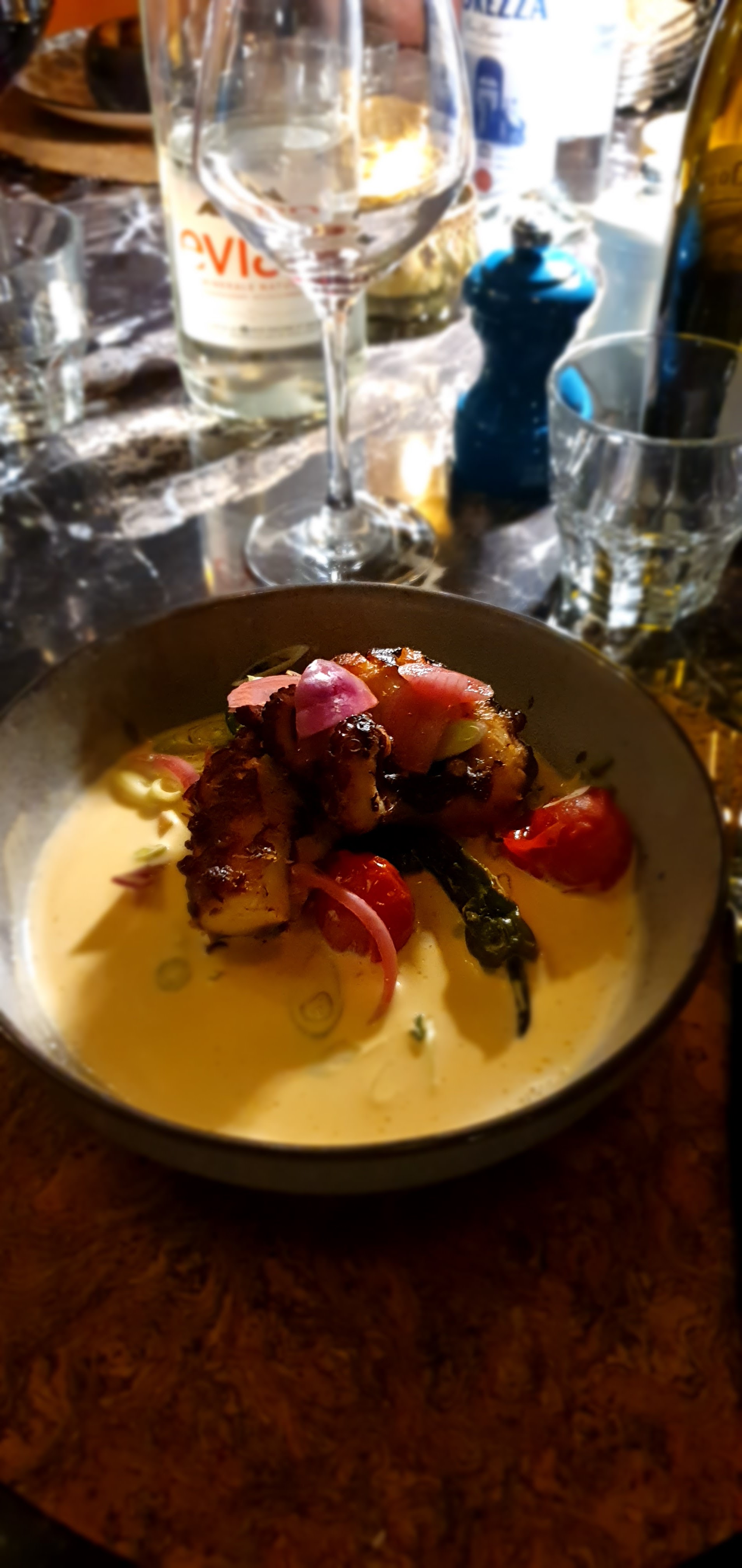 Nous avons passé une superbe soirée dans ce nouveau restaurant. Tout d'abord, la décoration est somptueuse et l'accueil très agréable. Ensuite, la cuisine est absolument délicieuse. J'ai pris le cabillaud rôti avec la mousse de burrata en entrée, c'était vraiment très bon. Puis nous nous sommes régalés avec le poulpe grillé, assez copieux. Le chef est passé nous voir, on a ressenti sa passion pour la bonne cuisine ! Bref, je recommande largement ce restaurant très bien situé. En plus les prix sont justes, ce qui me laisse penser que je me laisserais souvent tenter à y revenir !