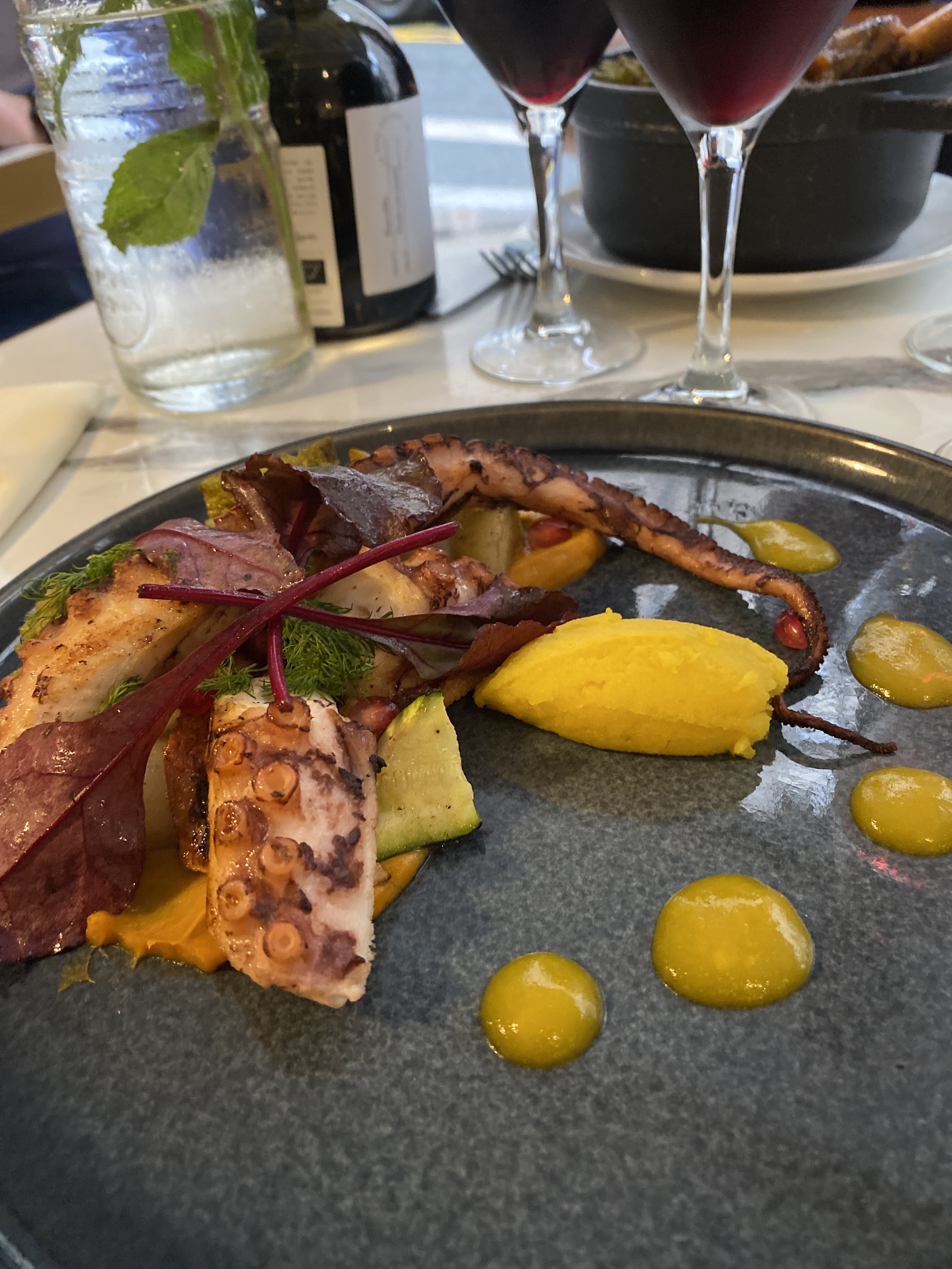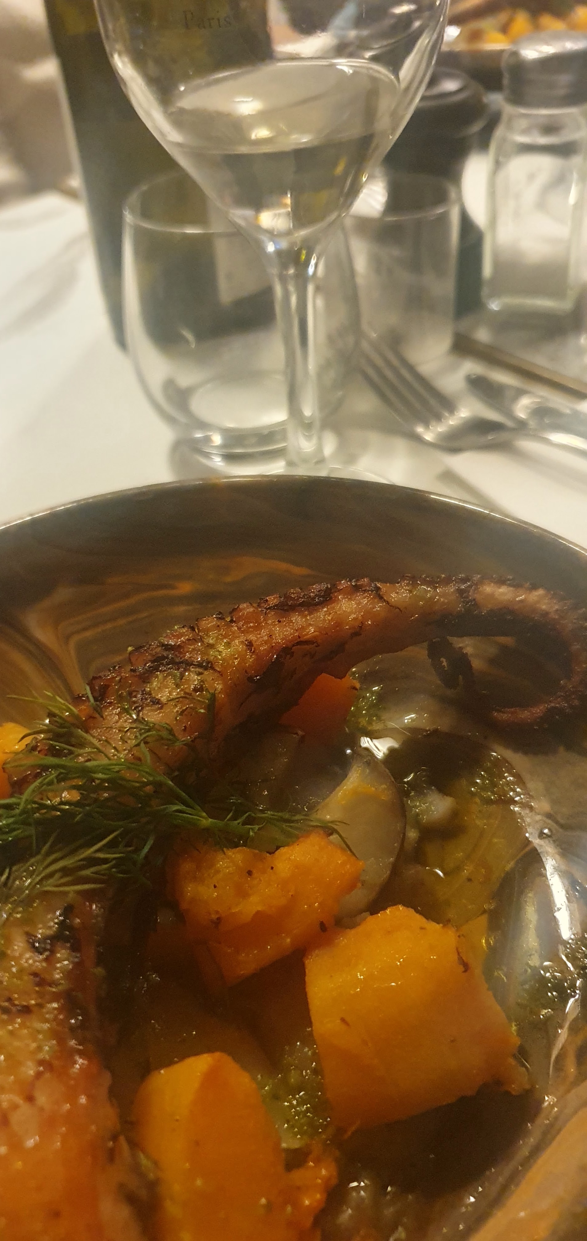 Le meilleur poulpe grillé de Paris. Dommage que le vin soit cher. Bravo autrement.