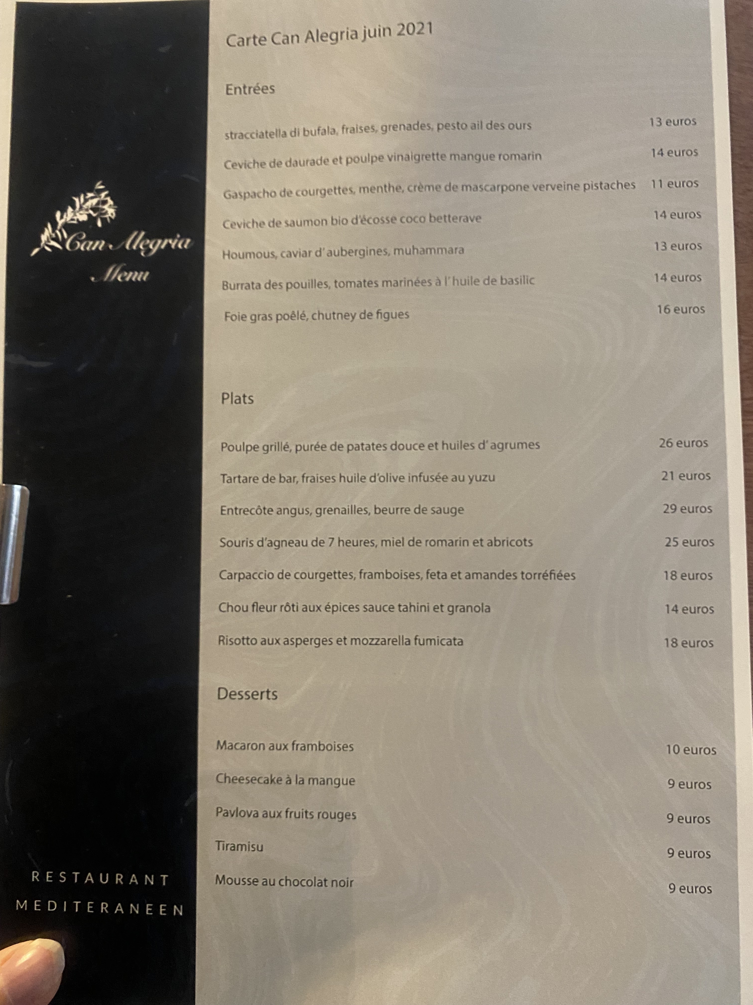 J’ai découvert Can Alegria au détour d’une publication qui encensait le velouté de champignons au fois gras. J’ai décidé d’y aller, et depuis, j’y passe régulièrement pour déguster les nouvelles créations du chef. Les plats sont bons, généreux, ils conviennent à tous. Des plats sans viandes sont disponibles et ils sont aussi bons qu’appétissants. Marc-Antoine, Mathieu et leur équipe m’ont toujours accueilli chaleureusement et dès les premiers pas dans leur établissement, j’ai su que j’allais passer un bon moment. Cela fait quelques années que je fréquente l’établissement, il n’y a aucune fausse note que ce soit dans la déco, le personnel et les plats qui y sont présenté. Je recommande chaleureusement ce restaurant pour les amoureux de la bonne cuisine.