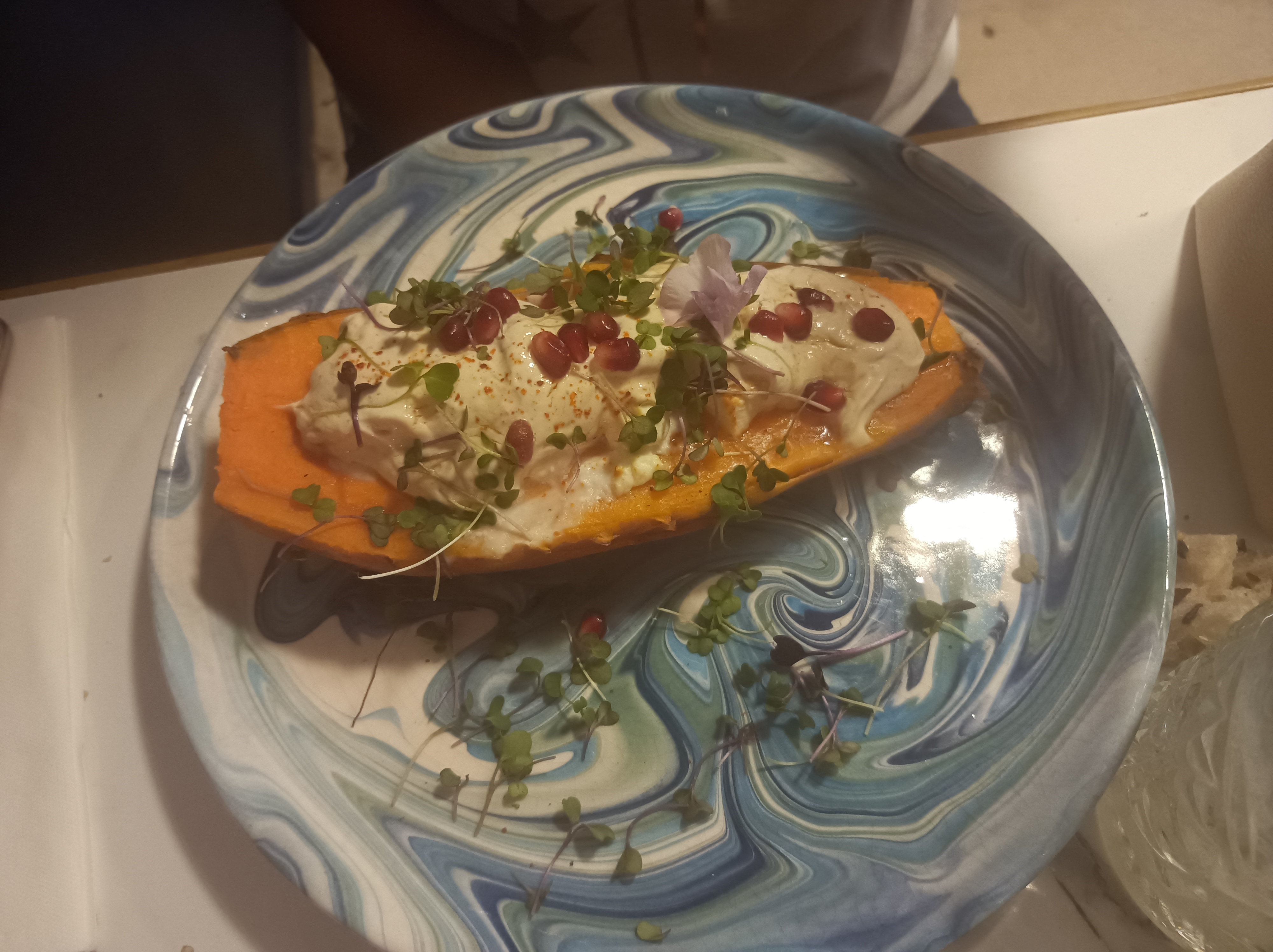 Quelle déception. Je me faisais une joie de tester cette adresse après avoir vu les avis positifs un peu partout. Malheureusement, si le cadre est sympa, les plats, eux, n'étaient pas à la hauteur de nos attentes. Le chou fleur rôti aux épices, sauce tahini est fade, la sauce beaucoup trop présente. La présentation n'a clairement rien à voir avec ce qui est publié sur les photos prise par le chef, à se demander si c'est le même plat. Le carpaccio de courgette n'a malheureusement pas plus de saveur. Le rapport qualité prix n'est pas au rendez vous. C'est l'incompréhension totale entre ce que nous avons eu comme expérience et celle décrite dans les commentaires. Edit : Je suis venue le 17 novembre