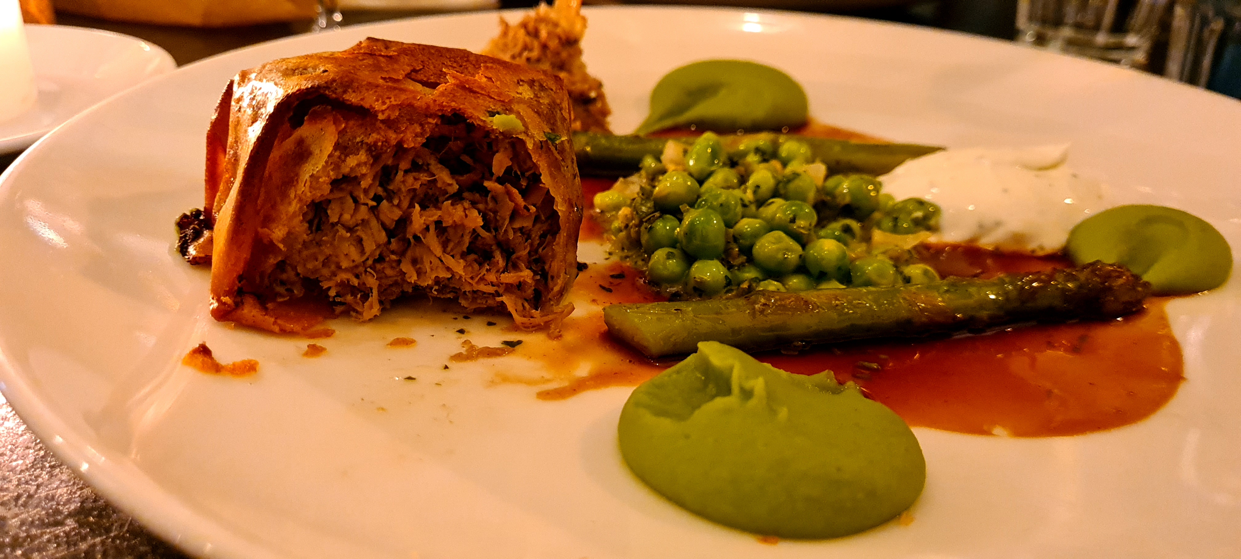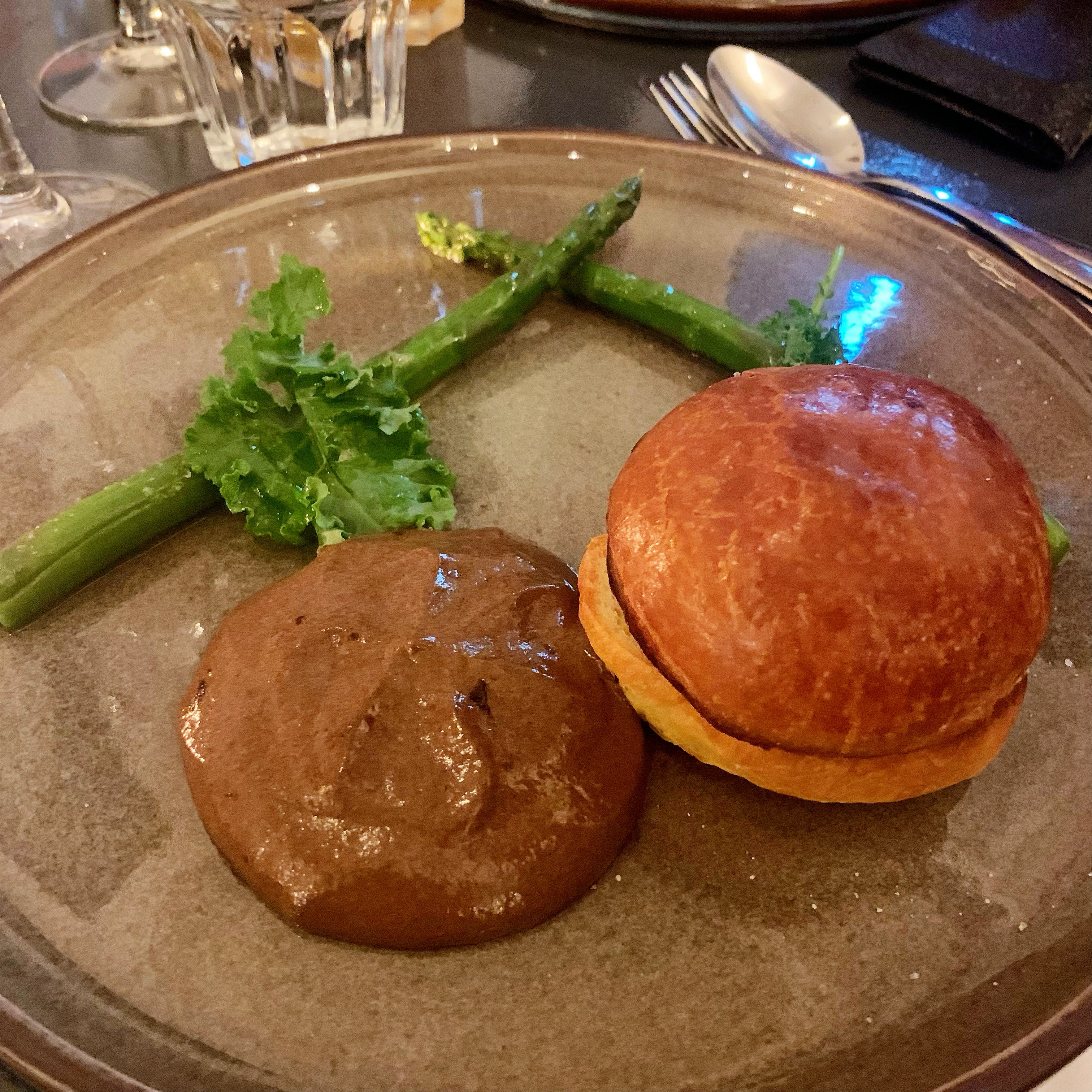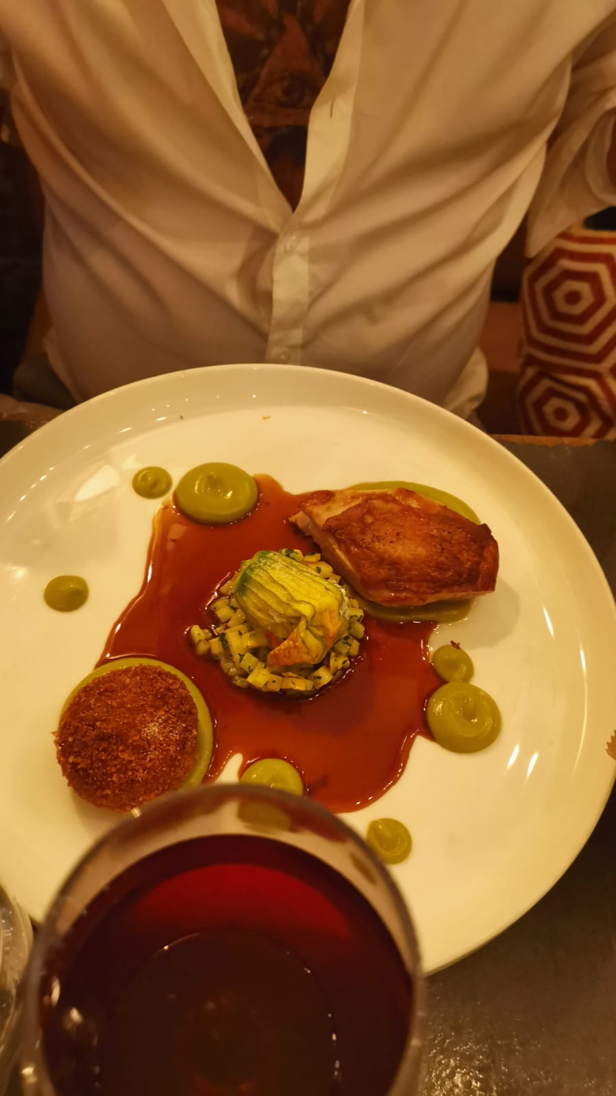 Notre premier repas à Nice. Bien mieux qu’au moins 1 restaurant 1 étoile Michelin à Paris ! Nous avons adoré l'entrée, la lotte, et nos plats principaux, le poisson du jour et le canard Wellington. Les plats de poisson montraient une cuisson parfaite du poisson. Pour le canard Wellington, personnellement, je préférerais une peau de canard plus fine et croustillante pour moins de gras. Les vins sont bons. Le service est excellent. L'environnement est un peu sombre mais j'aime l'ambiance. A tester absolument à Nice !
