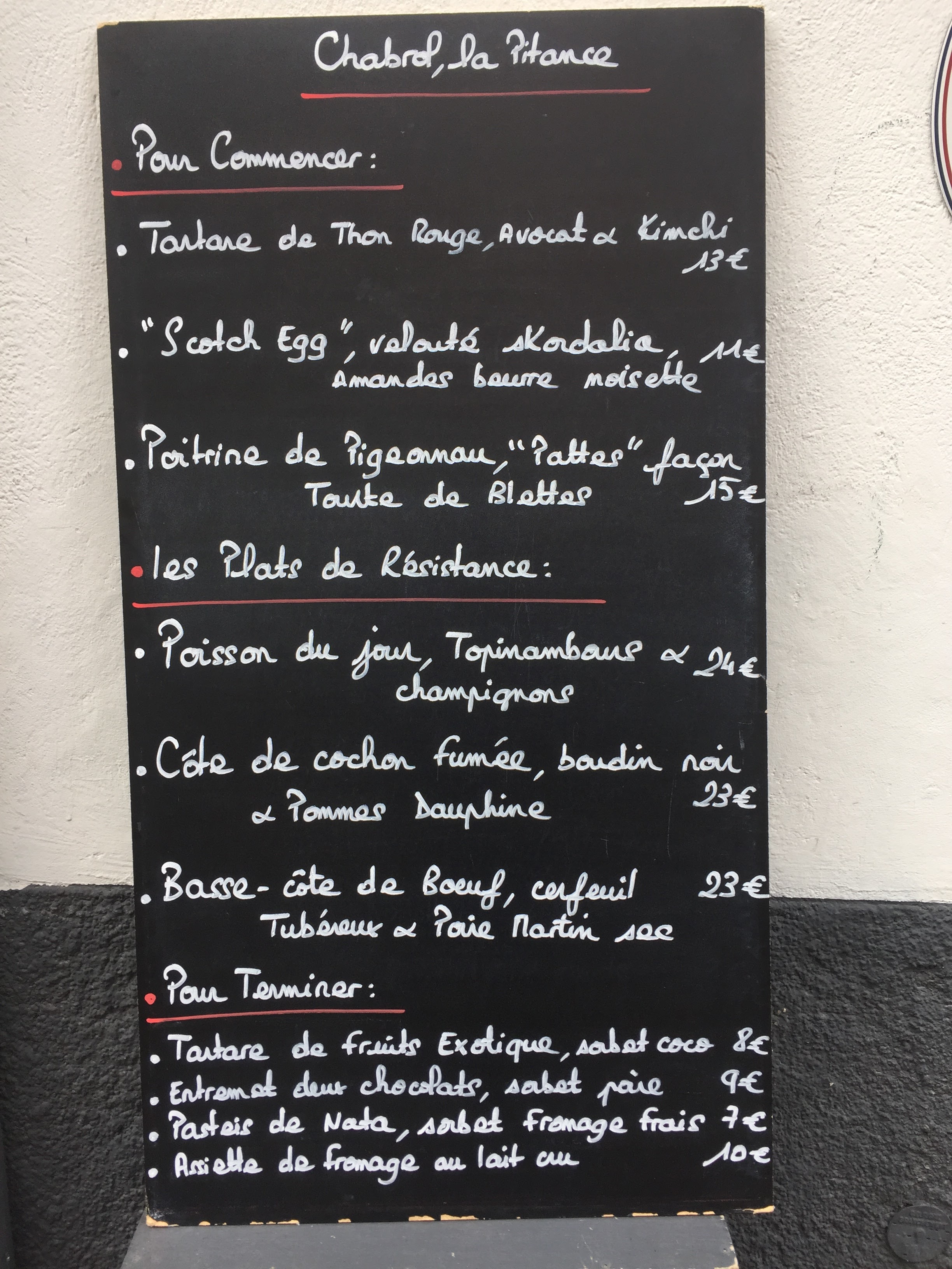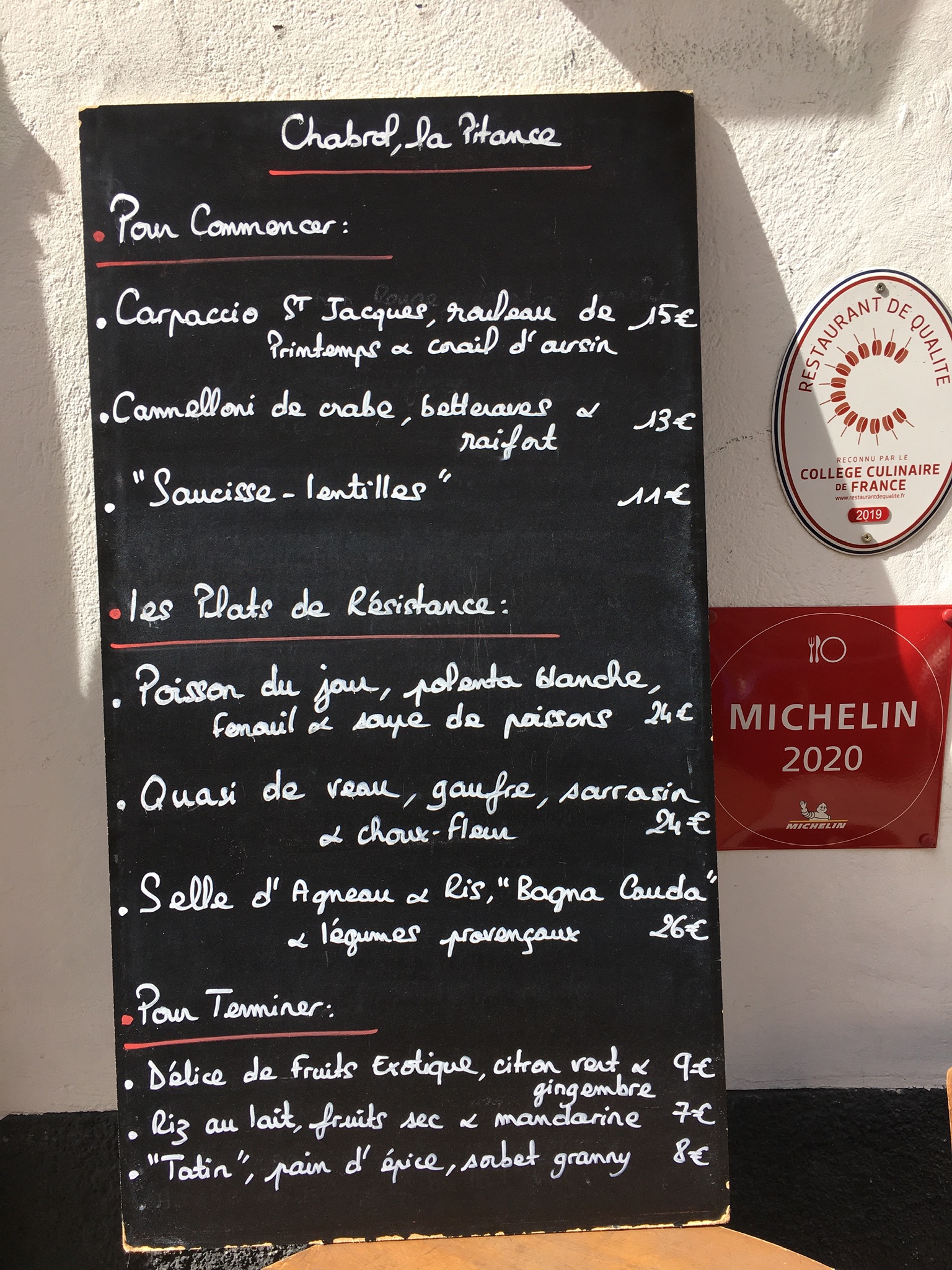 Il est une base première dans le commerce et à fortiori dans un restaurant : la qualité et la gentillesse de l’accueil. Au Chabrol, la personne qui nous a servis était soit dans un mauvais jour, soit doit changer de métier. Pas un sourire, pas un mot autre que le minimum du service. On vous tend le TPE de la carte bleue et on va voir une autre table. Vous avez l’impression de déranger, d’impatienter. Un peu comme si celui qui sert se considère indigne de ce rôle. Vous vous dites alors que la semi-gastronomie (c’est ainsi que dénomme le restaurant lui-même) vous séduira. Déception encore. Derrière des intitulés rutilants, se cachent des plats ordinaires et sans talent (un filet de maigre sans grand goût, un « cochon » peu cuit, un cake sec). Bref, vous vous en sortez avec 65 € par personne (avec une simple bouteille de vin du Verdon) !