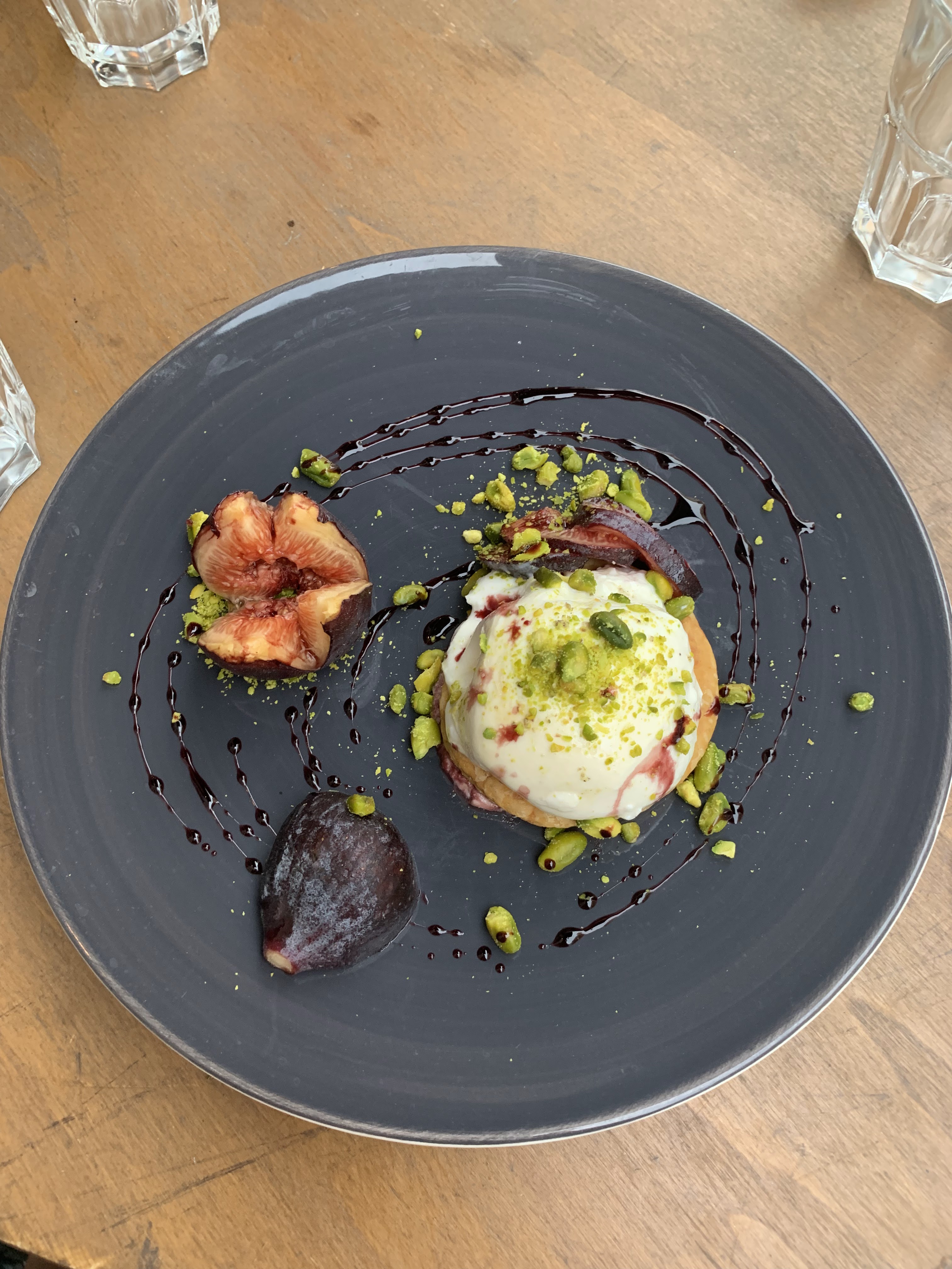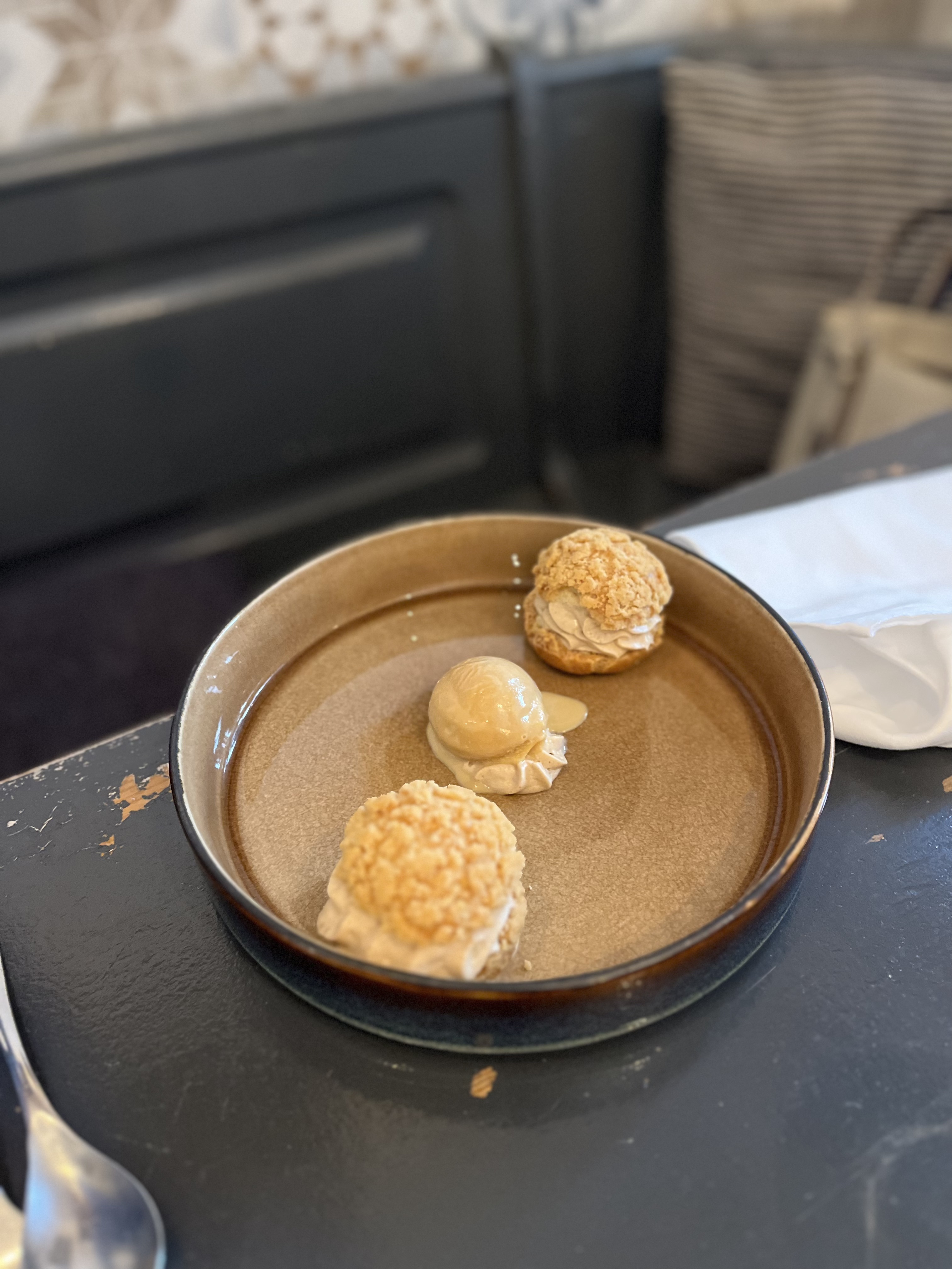 Nourriture exceptionnelle! Le poisson du jour, servi sur un lit de houmous et de fèves de coco, et le dessert au clafoutis aux raisins étaient un véritable incontournable. J'ai pris la photo la plus floue du poisson, ne vous laissez pas décourager par ma mauvaise photo. C'était la première fois que j'essayais les fèves de coco, j'étais heureuse qu'elles soient présentes dans deux de nos plats. Ils sont succulents ! Les entrées de falafel et de thon méditerranéen étaient bonnes, mais le poisson et le dessert étaient définitivement d'un autre niveau. Le clafoutis en lui-même n'avait rien de spécial, mais lorsqu'il était associé à la glace au rhum et aux raisins secs, il était devenu l'un des meilleurs desserts que j'ai jamais mangé. L'endroit est également très confortable avec beaucoup d'espace entre les tables pour une expérience culinaire confortable. L'un des meilleurs repas que nous avons eu en France !