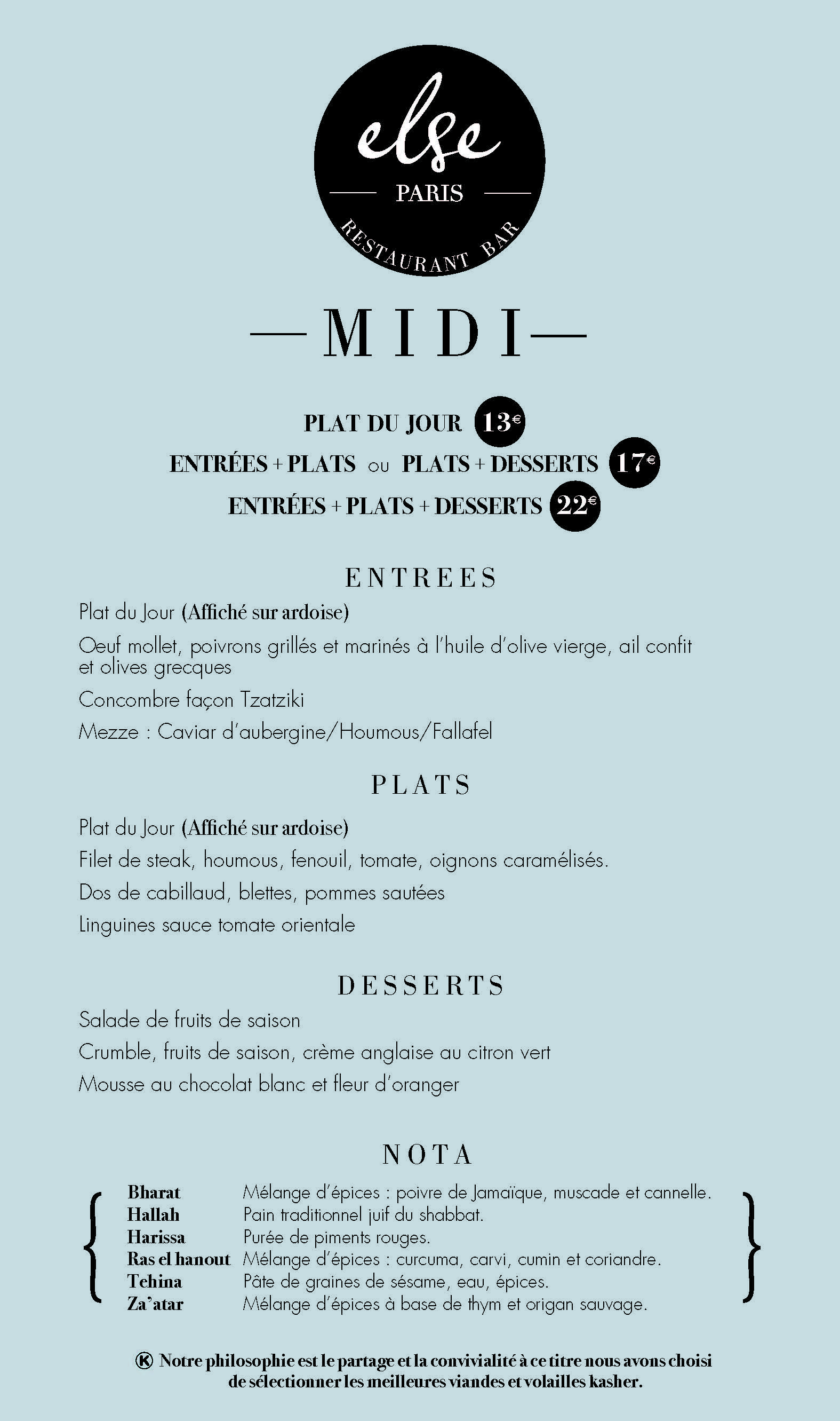 Chez Else, j’ai découvert la gastronomie israélienne, dans un cadre contemporain d’inspiration loft. En cuisine, le jeune chef franco-israélien Daniel Renaudie, propose une cuisine méditerranéenne très inspirée du Proche-Orient. Il considère en effet que la cuisine israélienne trouve son inspiration dans tout le Proche Orient. Il se plaît à travailler des produits frais mais surtout, il joue avec les épices. Ainsi chaque plat proposé est sublimé par un judicieux mélange de plusieurs épices, tantôt marinées, tantôt déposées après la cuisson… Un festival de saveur à chaque bouchée : tout est terriblement beau et bon. Au menu de notre déjeuner entre copines Krouvite (choux-fleur, tchina, potimarron, pois chiche, persil, bharat) et Taboulé (poulet, boulgour, persil, coriandre, menthe, oignons nouveaux, fruits secs). Les plats : Sinïa (viande hachée, pomme de terre, patate douce, bharat, tchina) et Shawarma (épaule d’agneau sautée au ras el hanout, graines de blé épicées, salade de tomate pimentée) Et un dessert pour deux : un délicieux Haleva (glace vanille, sésame, silam), qui n’a pas fait long feu… Pour déjeuner ou dîner du côté des Halles, optez pour Else… What Else ?