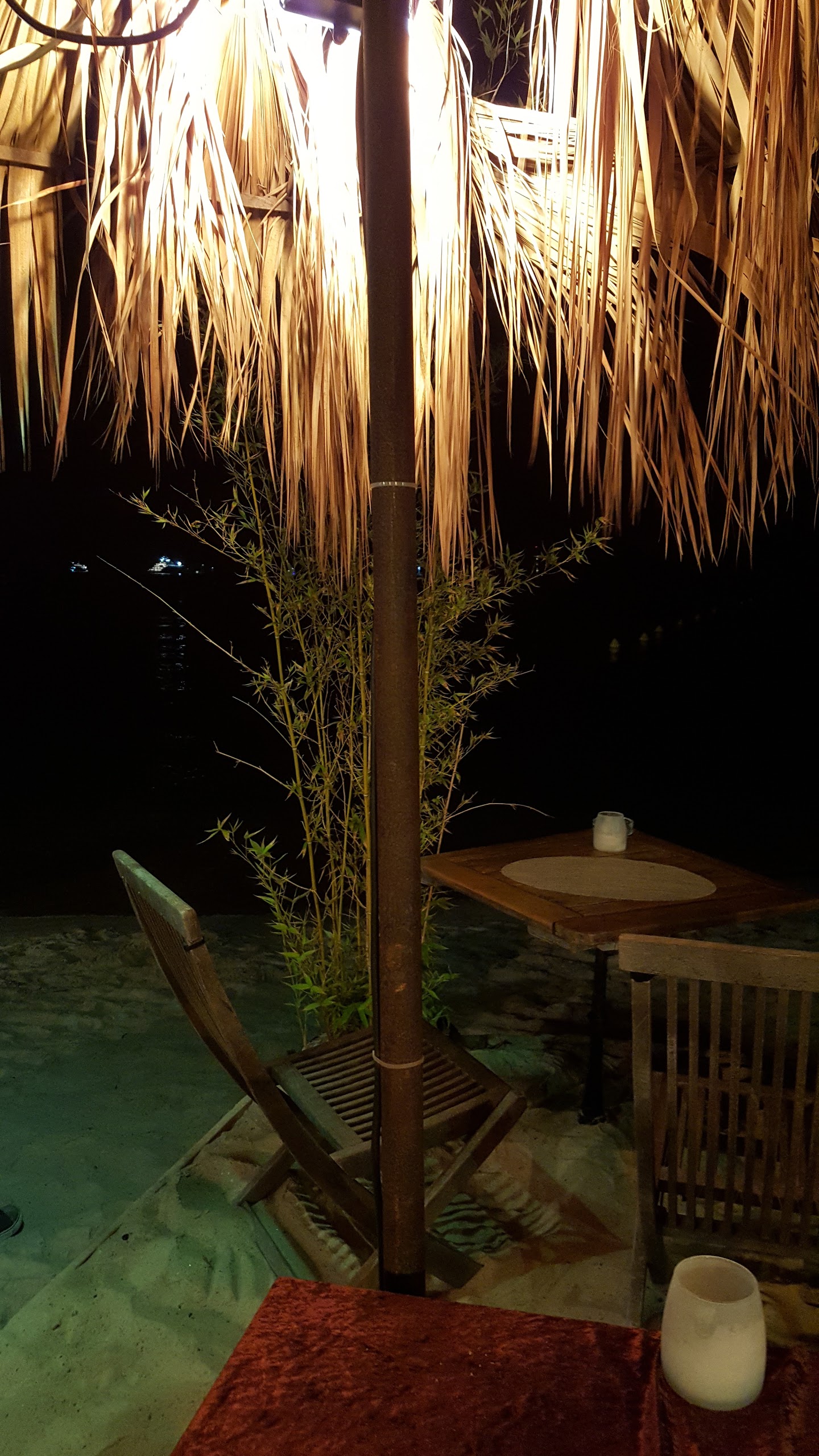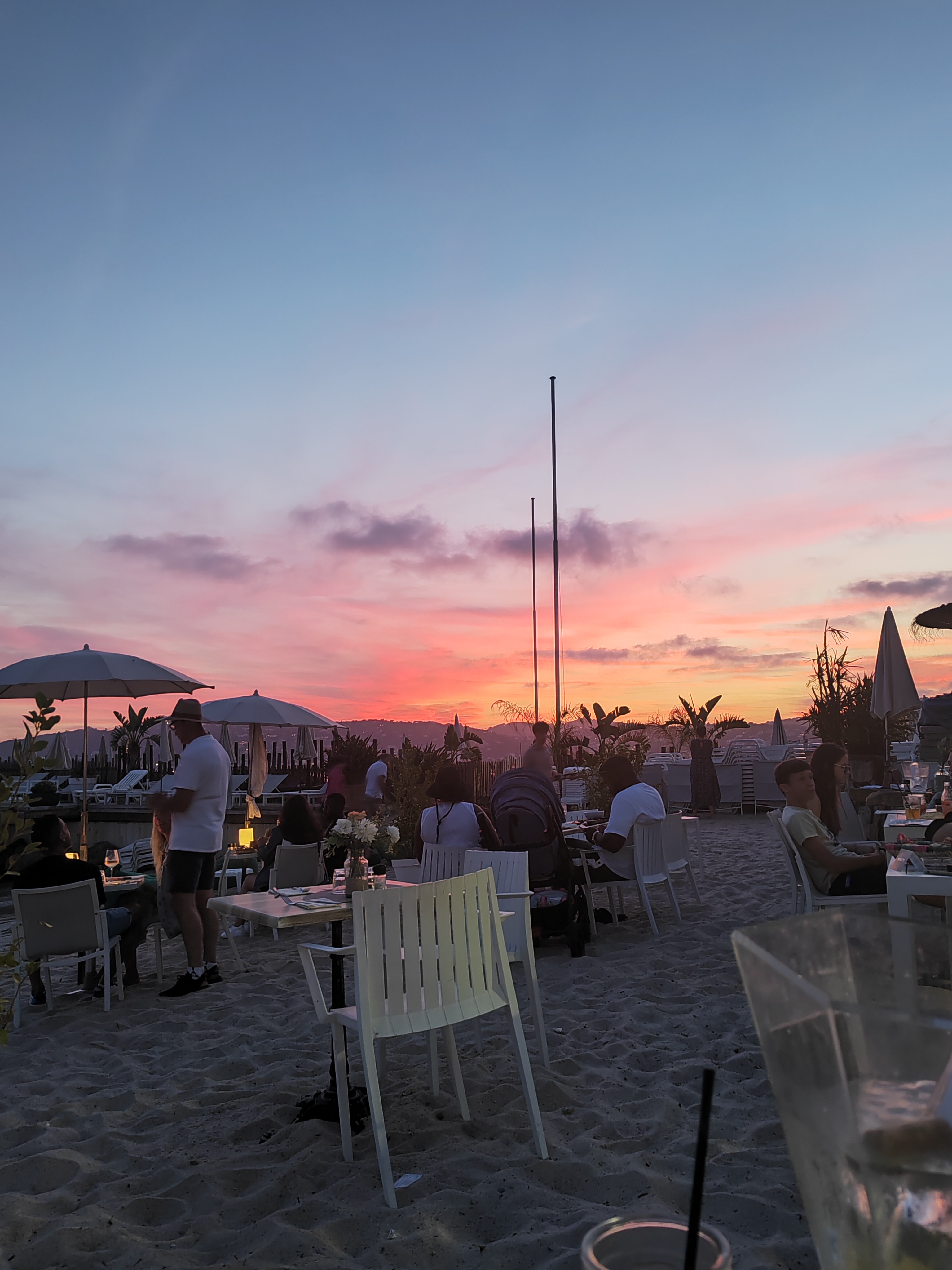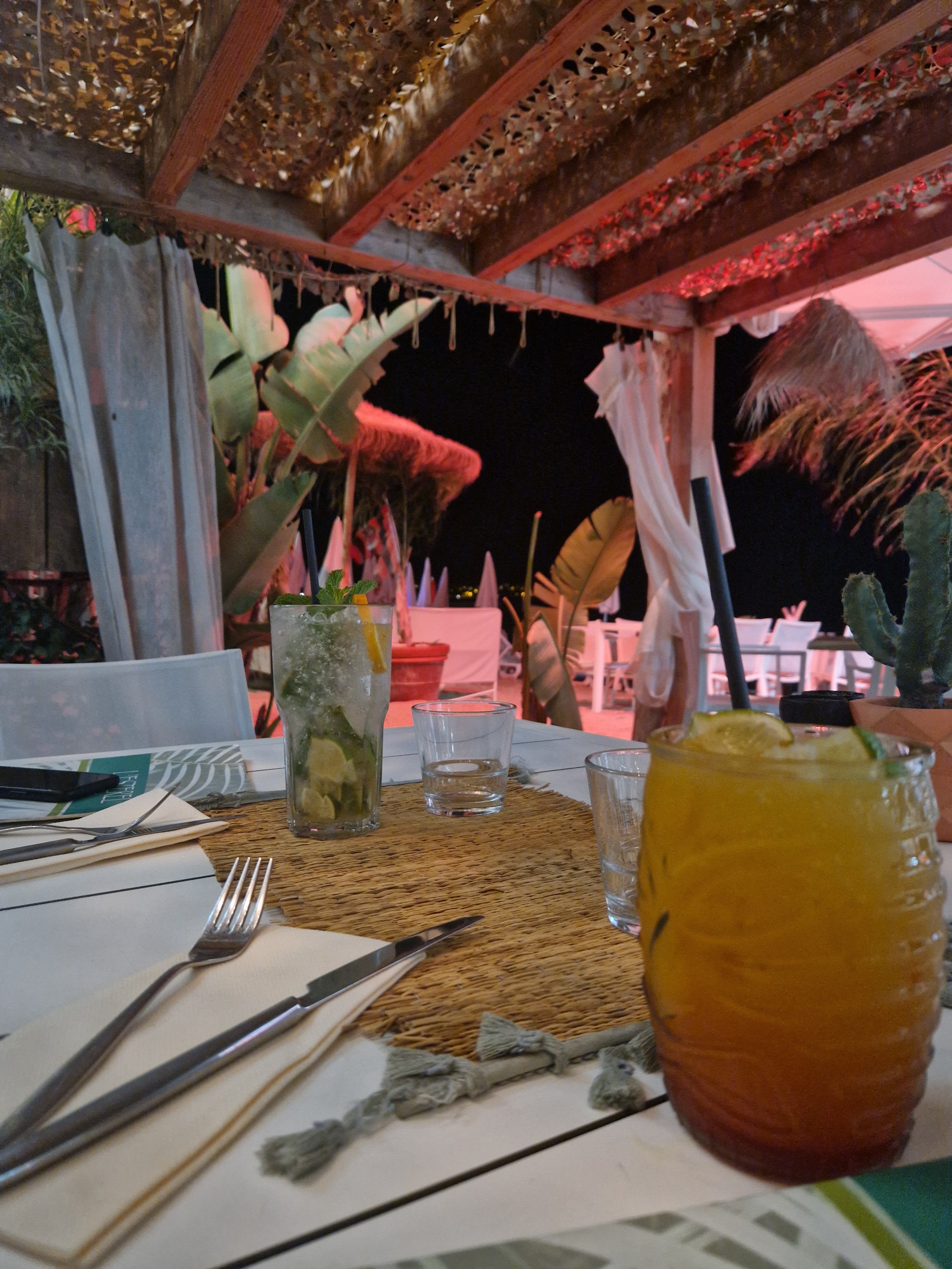 Avant d'arriver dans ce lieu nous avons tenté d'aller boire un verre dans deux plages différentes et nous nous sommes fait recaler car ils rangeaient les transats pour le service du soir. Très bizarre comme concept. Finalement nous sommes venus ici et nous n'avons pas regretté. Les tarifs sont assez élevés, mais en accord avec le cadre et l'aspect touristique. De plus nos deux cocktails étaient excellents et la serveuse très sympathique. Nous reviendrons certainement. À noter que si vous souhaitez manger là-bas un soir de feu d'artifice, il est conseillé de réserver 4 à 5 jours avant pour avoir une table.
