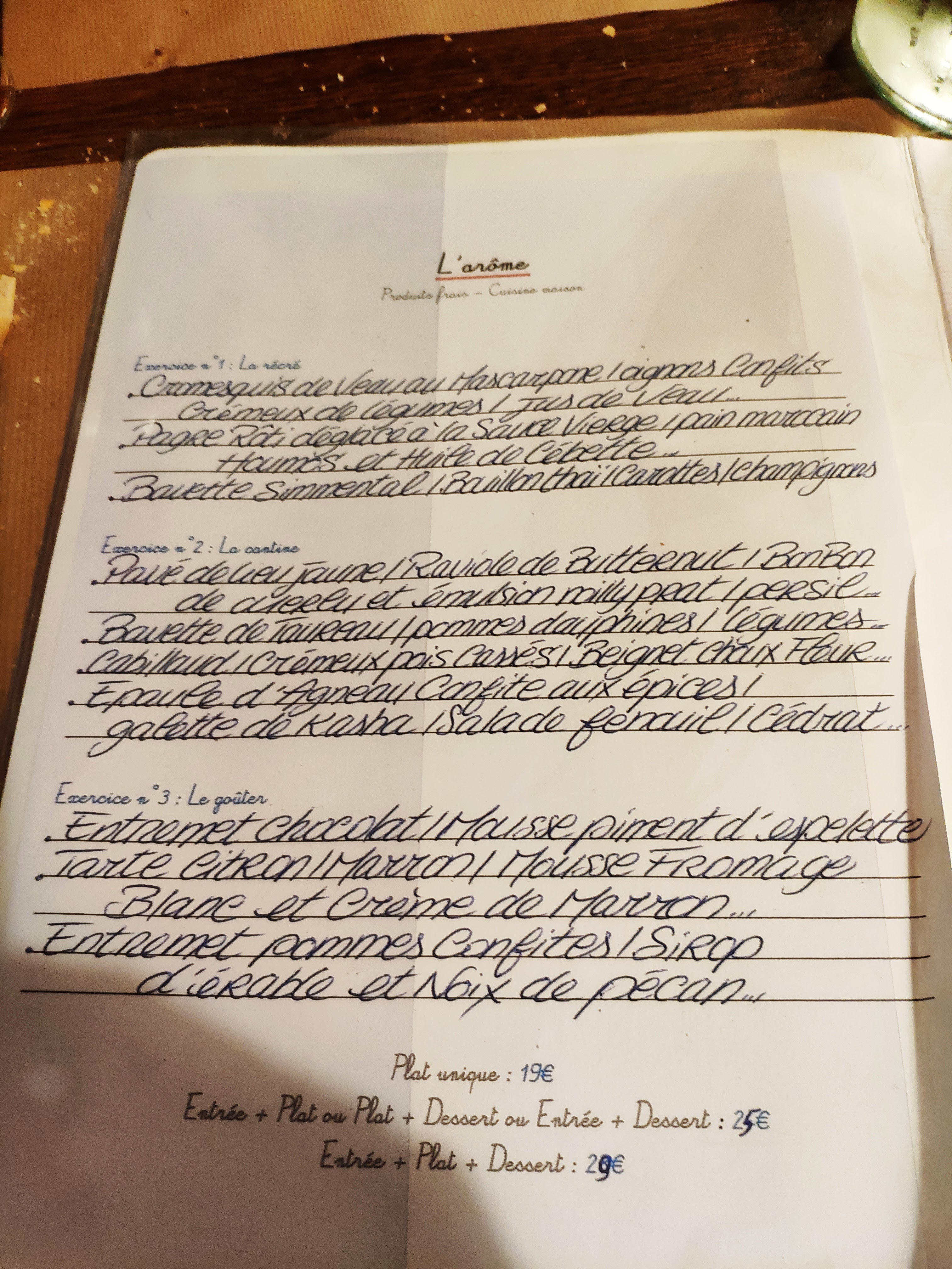 Posté le 13/12/2021 à 12:20"Déçue par ce restaurant En arrivant, une enceinte Bose un peu cheap diffusait de la musique assez forte et avec une qualité un peu moyenne dans l'entrée du restaurant. Bon soit. Nous sommes installés dans la salle mitoyenne. La déco est rustique. Ça ce veut rentrée des classes mais ca manque un peu d'imagination. Le menu arrive dans une sorte de lutin vraiment pas joli, le menu est barbouillé à la main à côté de gribouillis un peu bizarres. Franchement je comprends le thème mais il y a tellement de façon de faire plus soigné. Une fois encore, on se dit bon, soit. Mais le pire a été le service des plats. A peine 2 minutes après notre commande arrive nos entrées (tièdes). Une raviole, savoureuse, mais dans un bouillon froid, c'est dommage. A peine les entrées terminées, on nous sert le plat (joue de boeuf), et la c'est la goutte. Toutes nos assiettes sont froides. Nous demandons à faire réchauffer. Le plat est bon mais cela a gâché la dégustation. Les prix sont corrects mais la qualité et le service est un peu limite."