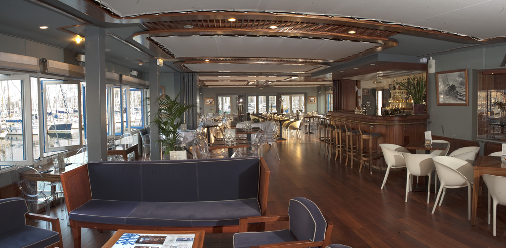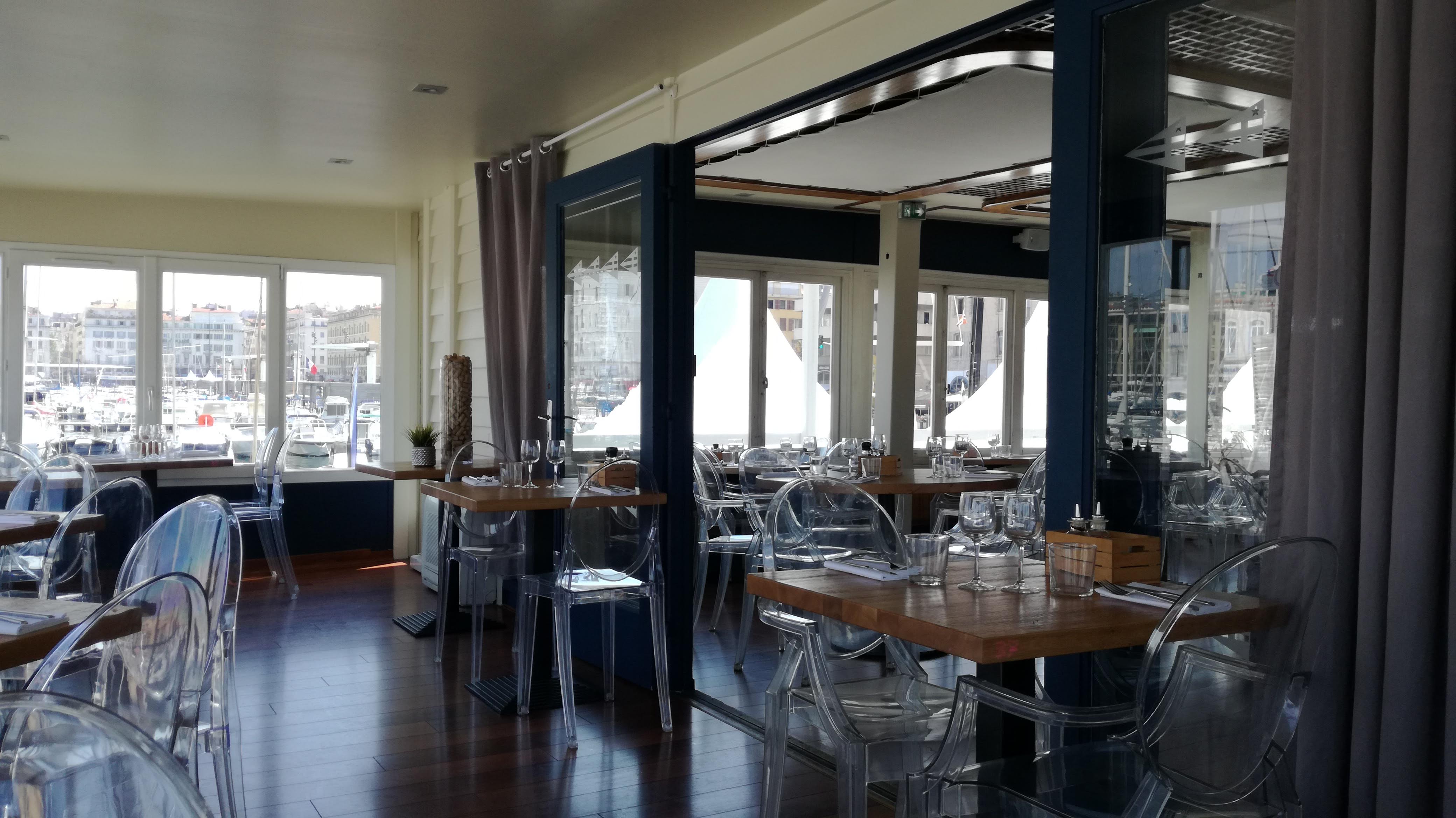 Posté le 28/06/2018 à 08:55"Nous sommes venus un samedi midi , pensant qu'il y aurait foule vers 13h00. Ben non, la salle est grande totalement immergée dans le vieux port puisqu'il s'agit d'un restaurant flottant que l'on pourrait croire réservé au club nautique. Le cadre et la salle valent 5 * sans hésitation. Le service est très courtois et plaisant. Nous avons pris 3 entrées distinctes : salade de poivrons marinés, tartare de saumon et supions : très bien, c'est frais et bien présenté. Nous avons cependant demandé à changer les supions qui étaient trop cuits initialement. Aucune discussion pour les changer, on a même eu droit à des excuses. En plat, on a tous choisi le loup grillé et franchement, cela vaut largement 5* . Bien cuit, bien assaisonné avec du thym et du fenouil, un régal. Et puis il y a eu les desserts, là, c'est une grosse déception, tarte aux fraises avec peu de fraises et beaucoup de crème , le biscuit était industriel. Autre dessert du jour ; pêche à la menthe avec une boule de glace vanille. La pêche n'était pas assez mûre et la menthe emportait tout le goût. Au final, très bonnes entrées, excellent poisson mais dessert très décevant, le tout dans un très beau cadre avec un service très attentionné."