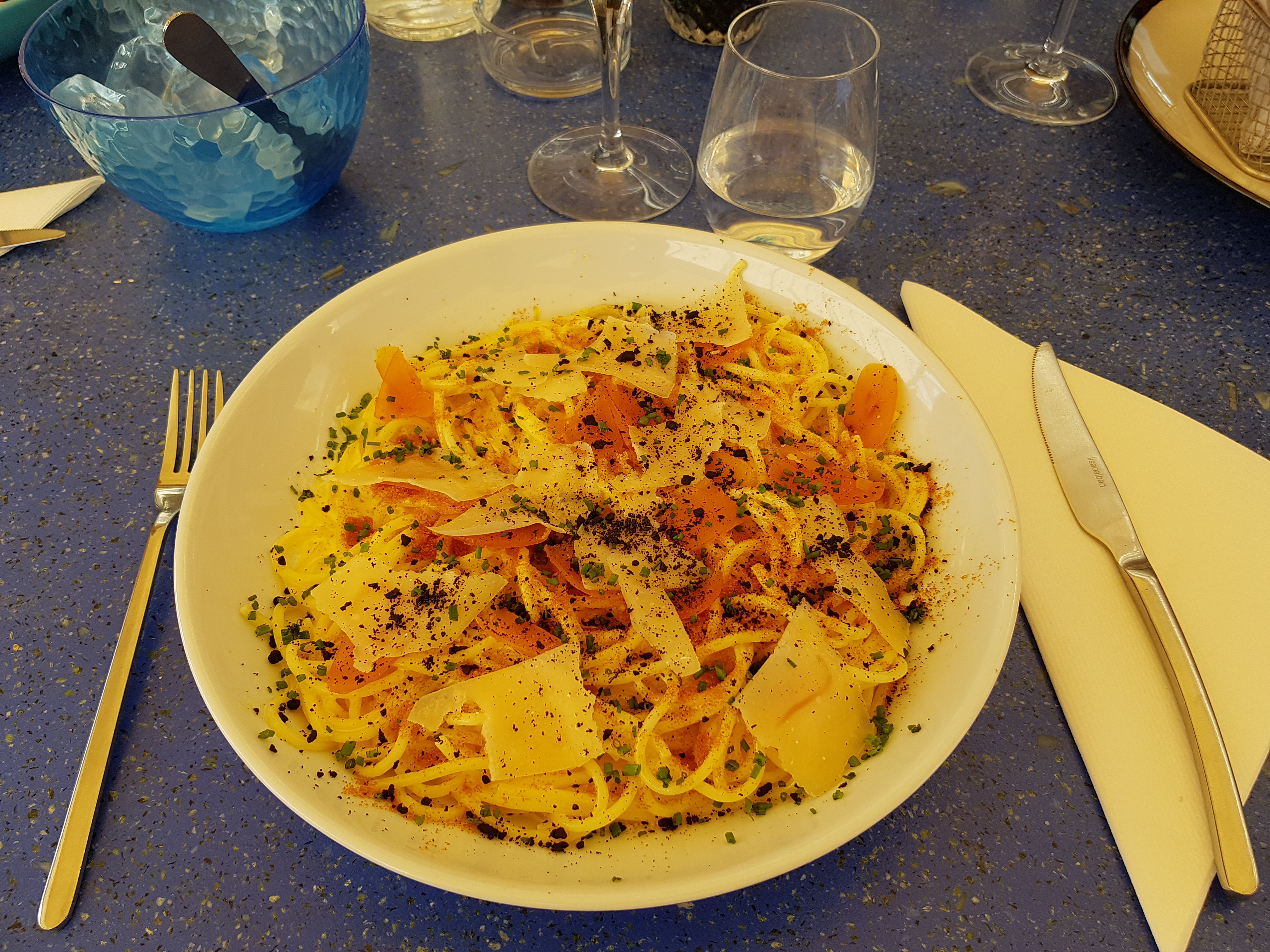 Serveuses très gentilles et attentionnées. Linguines à la poutargue excellentes avec une cuisson al dente. Petit verre de Sartene blanc qui va bien avec...