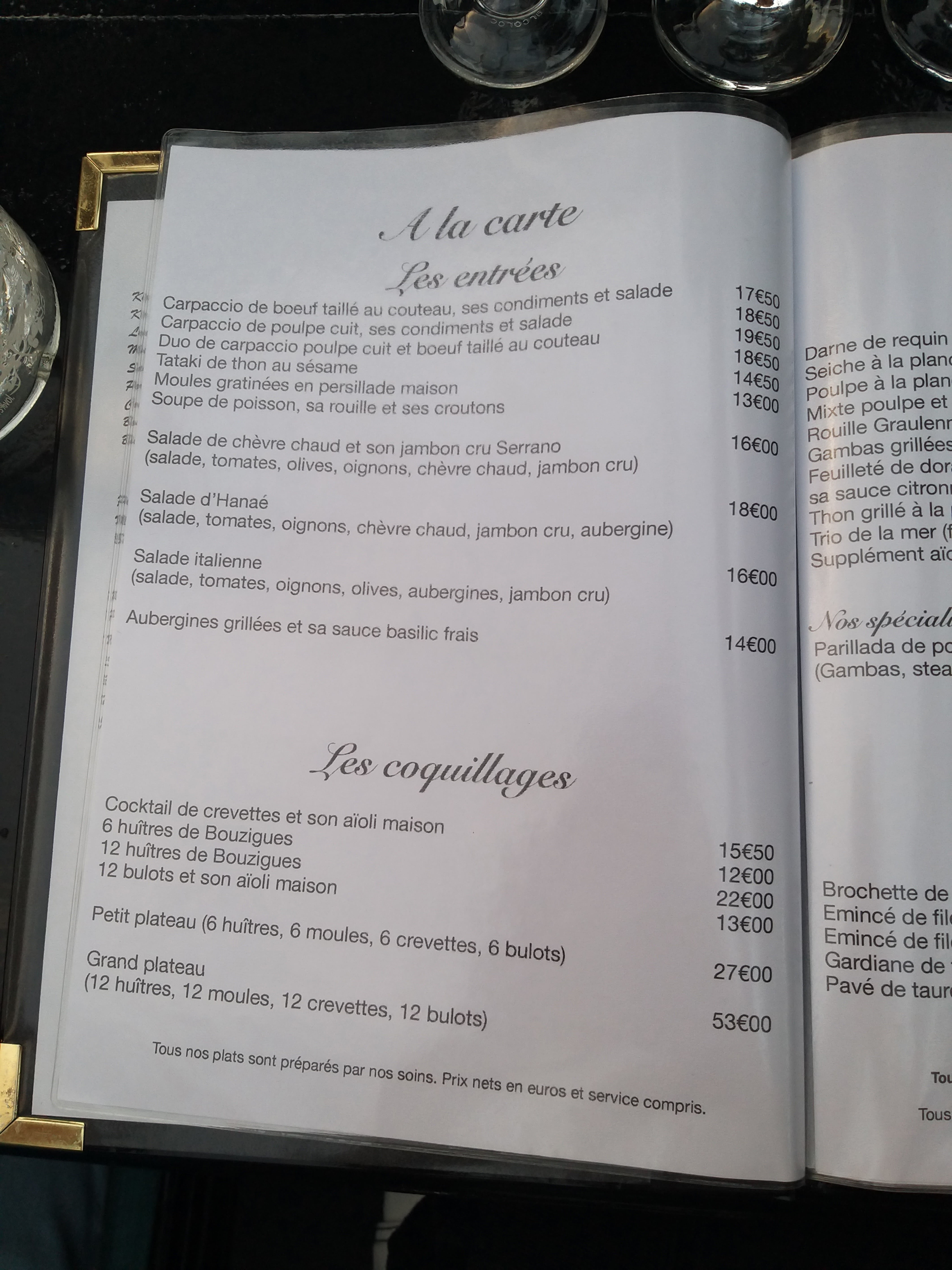Posté le 24/06/2023 à 13:56"Un endroit plutôt calme ,près du port. Les mets présentés sont sans prétentions à l'image de ce que l'on trouve en général dans cette commune touristique. Le vin au verre proposé ne mérite pas le détour et autant se contenter de la carafe d'eau fraîche à disposition. Bref, restaurants à touristes de passage ,mais sans plus . Bon point, sièges confortables en terrasse et l'intérieur du restaurant qui apparaît sympa."