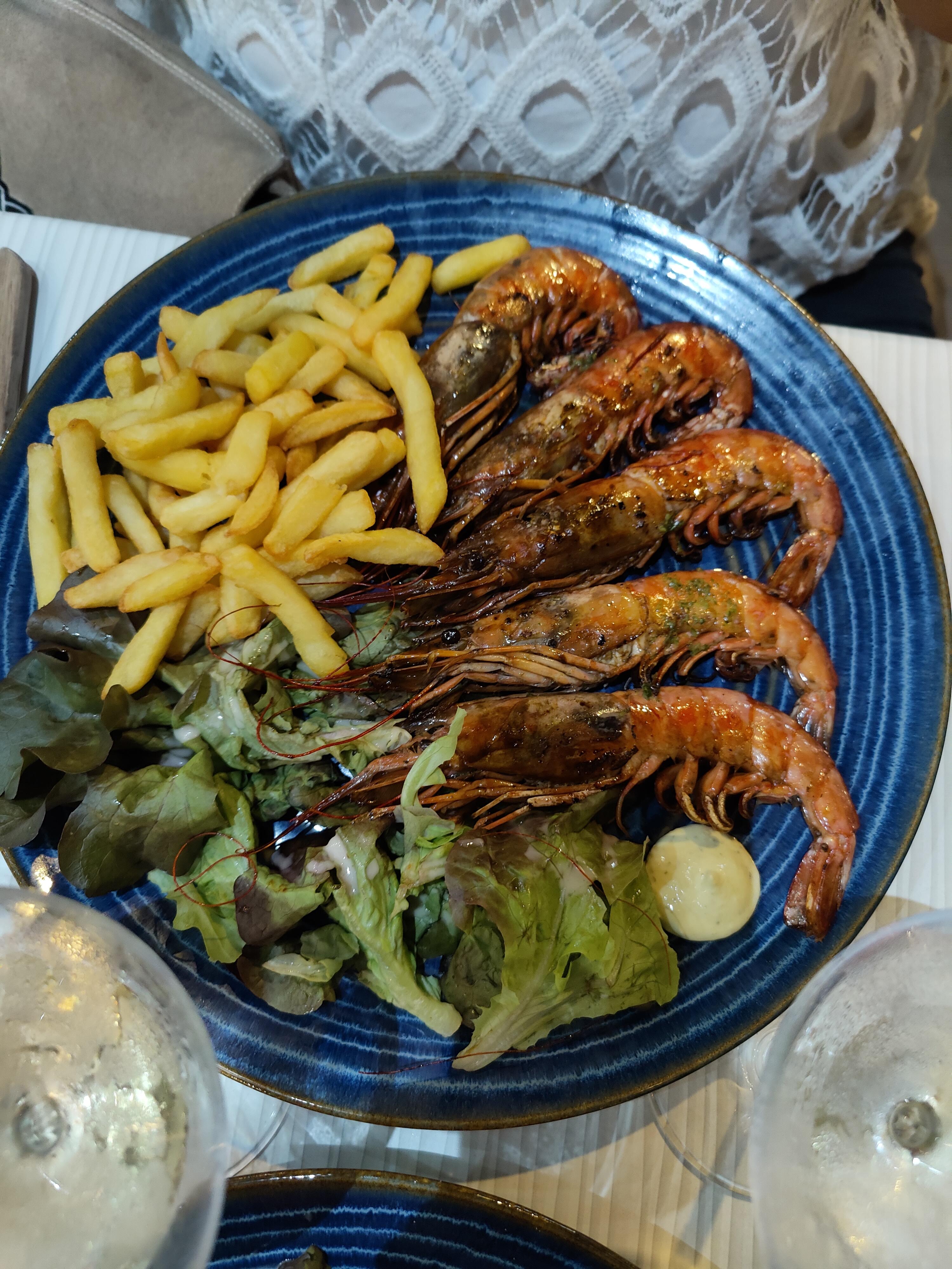 Les enfants ont eu des moules ( ont avaient l’impression qu’elles étaient noyés dans un cubi de vin…) frites dans une mini panière à même la table sans assiette…. Nous avons pris en entrée/plat : saumon Gravlax/ gambas…. Autant dire qu’on avait encore faim après on a dû finir dans un snack!! Restaurant donne l’impression de se dire « dans tout les cas on ne les rêvera pas » vis à vis des clients!