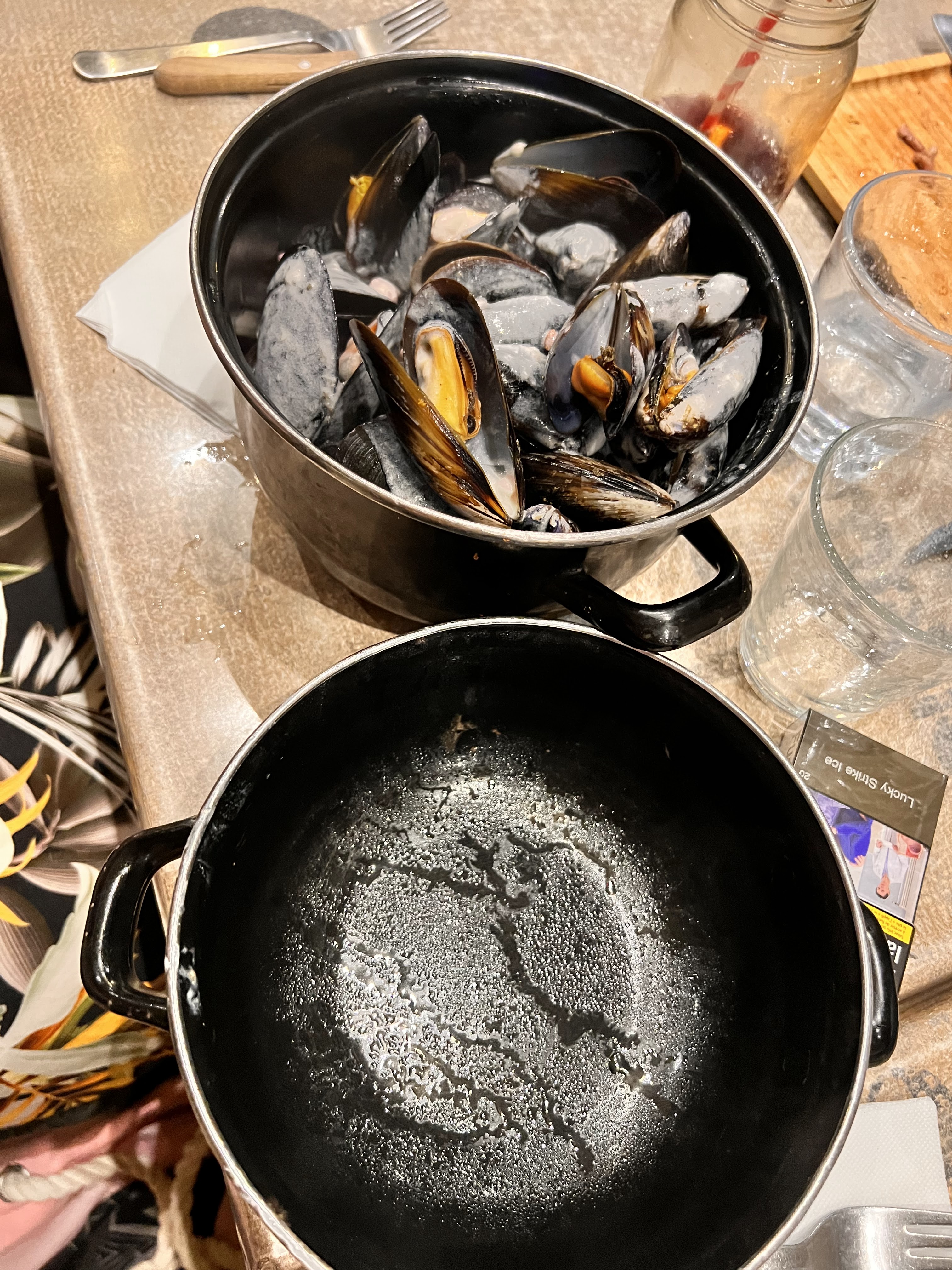 Burger trop cuit, le pain est dur, le fromage est mis avec la croûte qui ne se mange pourtant pas, les frites sont vite sèches, dans les moules il y a une tonne de céleri (pourquoi ?) et le plat est servi en même temps que l'apéro, on n'a même pas eu le temps de commencer le petit pot d'olives. Les prix sont élevés. Nous sommes plutôt déçus.