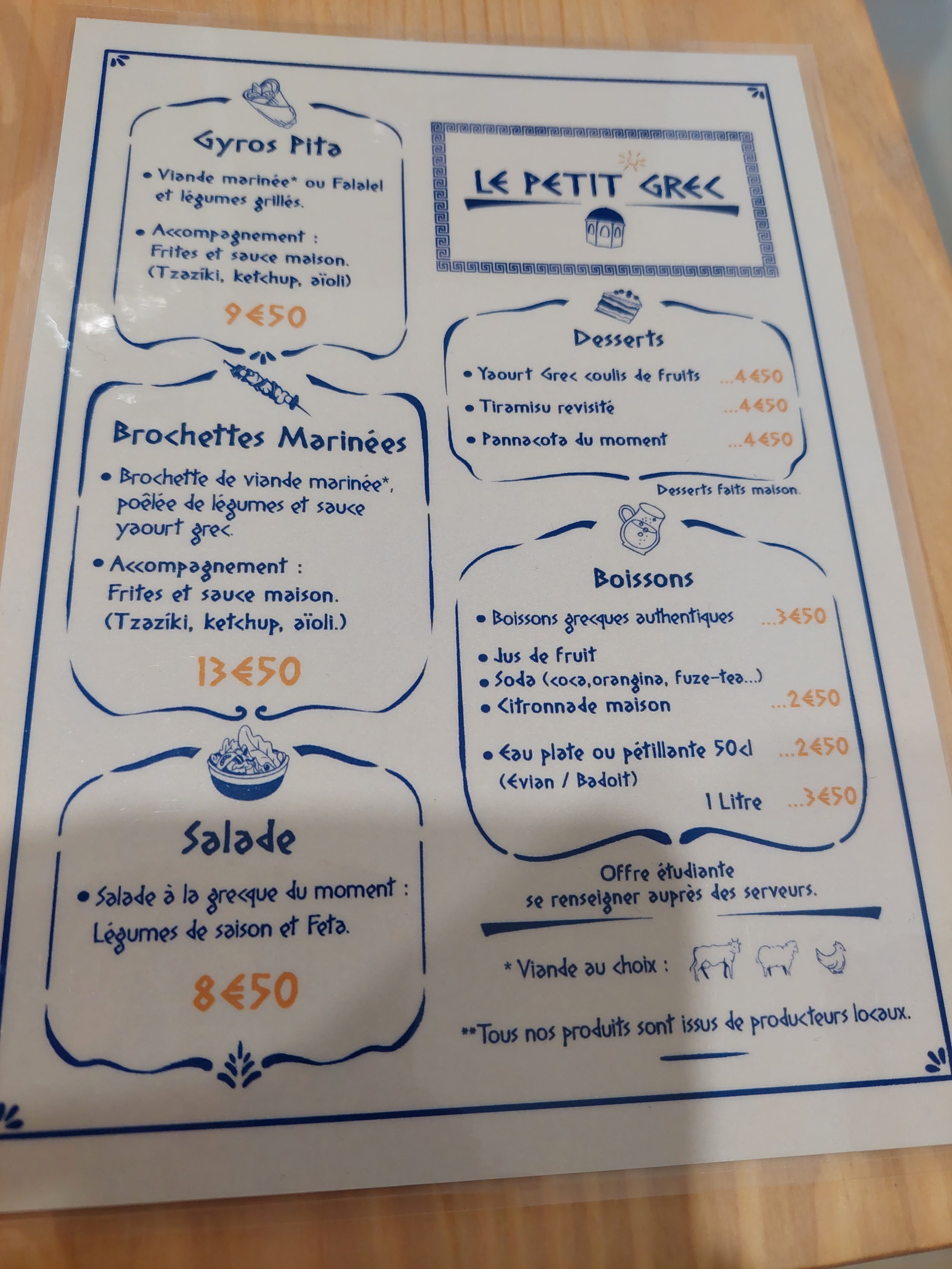 Accueil chaleureux. L'équipe est très souriante. Les repas sont copieux, et vraiment délicieux. Je vous conseille leurs Gyros Pita qui sont une vraie tuerie, sans parler du Tiramisu pistache !! J'ai aussi trouvé que le fait d'avoir de vraies boissons importées de Grèce, rajouter un plus à la carte ! Je recommande vivement !