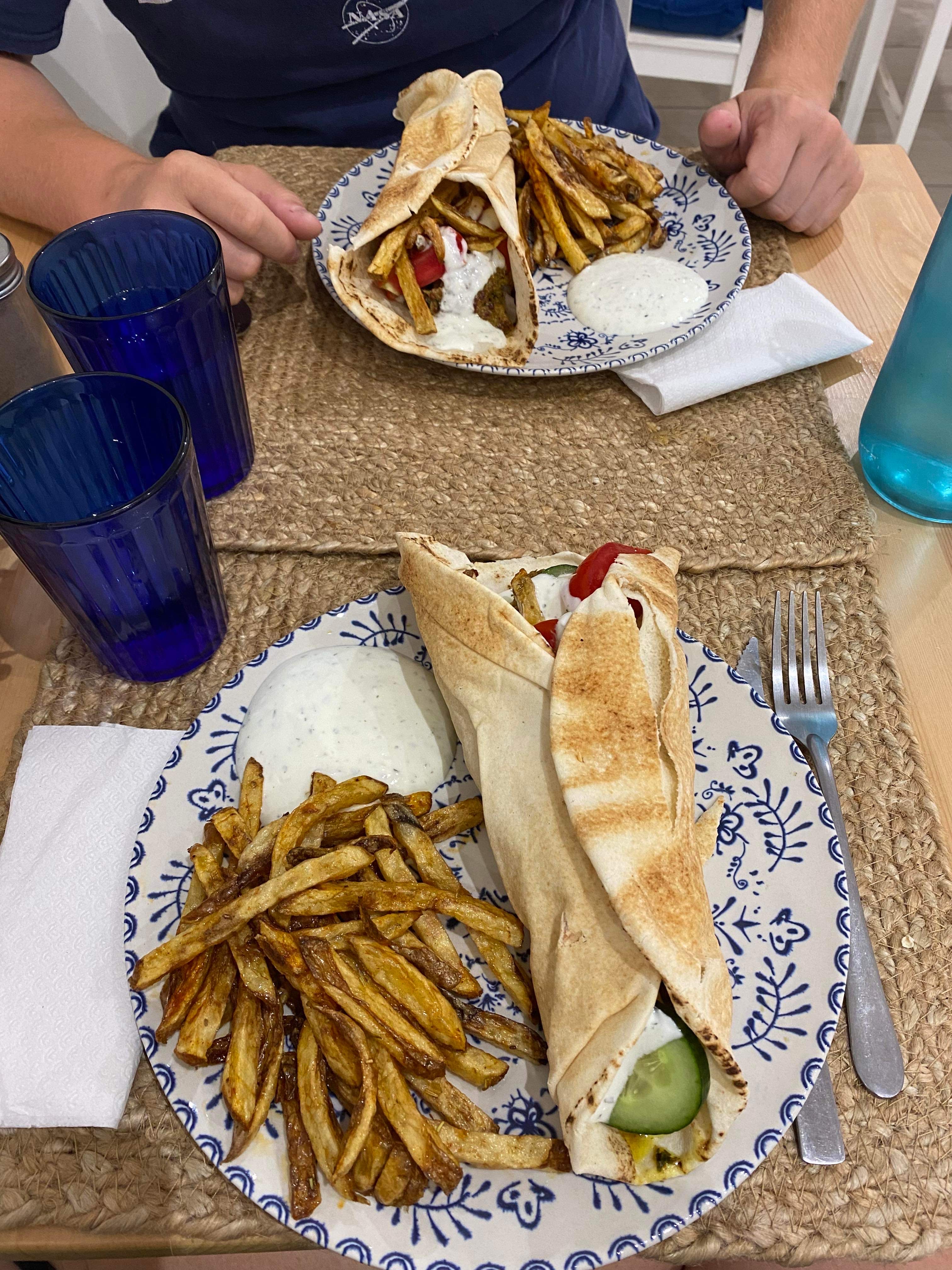 Nous nous sommes arrêtés ici pour le déjeuner et j'ai été très déçu. Nous avons commandé la salade grecque et un gyroscope de bœuf et d'agneau. La salade datait de plusieurs jours car la laitue avait commencé à dorer sur les bords et les tomates étaient gorgées d'eau. La viande dans les gyroscopes était très grasse pour l'agneau et macabre. Le bœuf était un peu dur mais ok. La star était de loin les frites maison. Ils étaient délicieux.