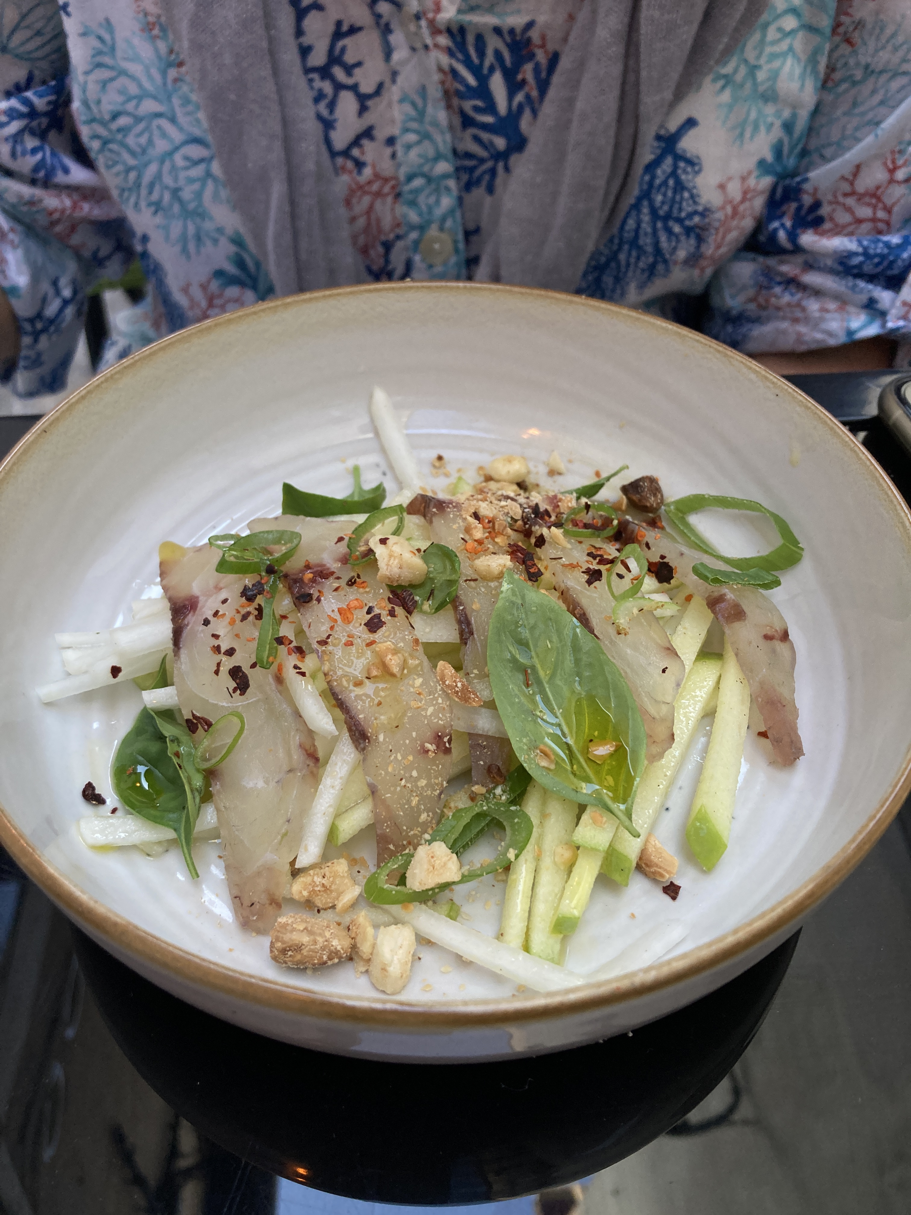 Choix d'entrées alléchantes. Le carpaccio de maigre était très bien assaisonné mais le veau snacké était un peu sec mais comme on est en vacances on s'en bat les c*******. Concernant les plats, très goûtus. Pas de desserts, on a préféré les digeos. Les serveurs sont très sympas. Petit bémol pour les poissons rouges malheureux dans le bocal. Quoi qu'il en soit nous avons passé une très bonne soirée.