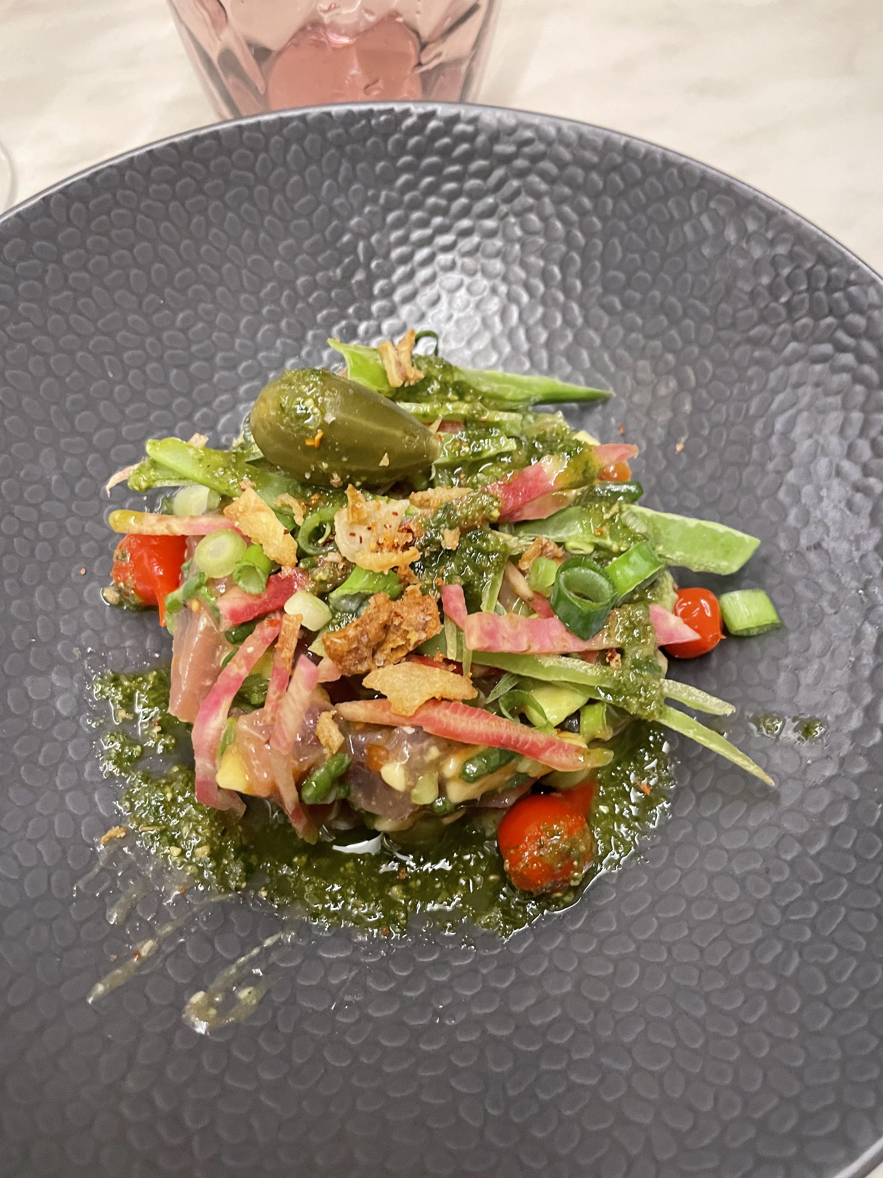 Nourriture délicieuse, personnel sympathique, charmant café en bord de rue. Notez qu'ils sont populaires pour le dîner et que le personnel est très petit - une hôtesse/serveur et un chef - alors préparez-vous à savourer un repas très tranquillement si vous y allez vers 20 heures. Ça vaut vraiment le coup d'attendre ! Nous avons commandé une assiette de charcuterie en entrée et les jambons crus et les saucisses étaient délicieux ! Pour le dîner, nous avons commandé des pâtes au pesto et des tonnes de légumes frais parfaitement al dente et savoureux, ainsi qu'un saumon en croûte de sésame avec une purée de carottes et de noix de coco - la purée était incroyable ! Crémeux, léger et juste assez sucré. Le saumon était incroyable - parfaitement cuit et savoureux. Nous avons accompagné le dîner d'un rosé léger, aux arômes de pommes et de poire, mais pas trop sucré.