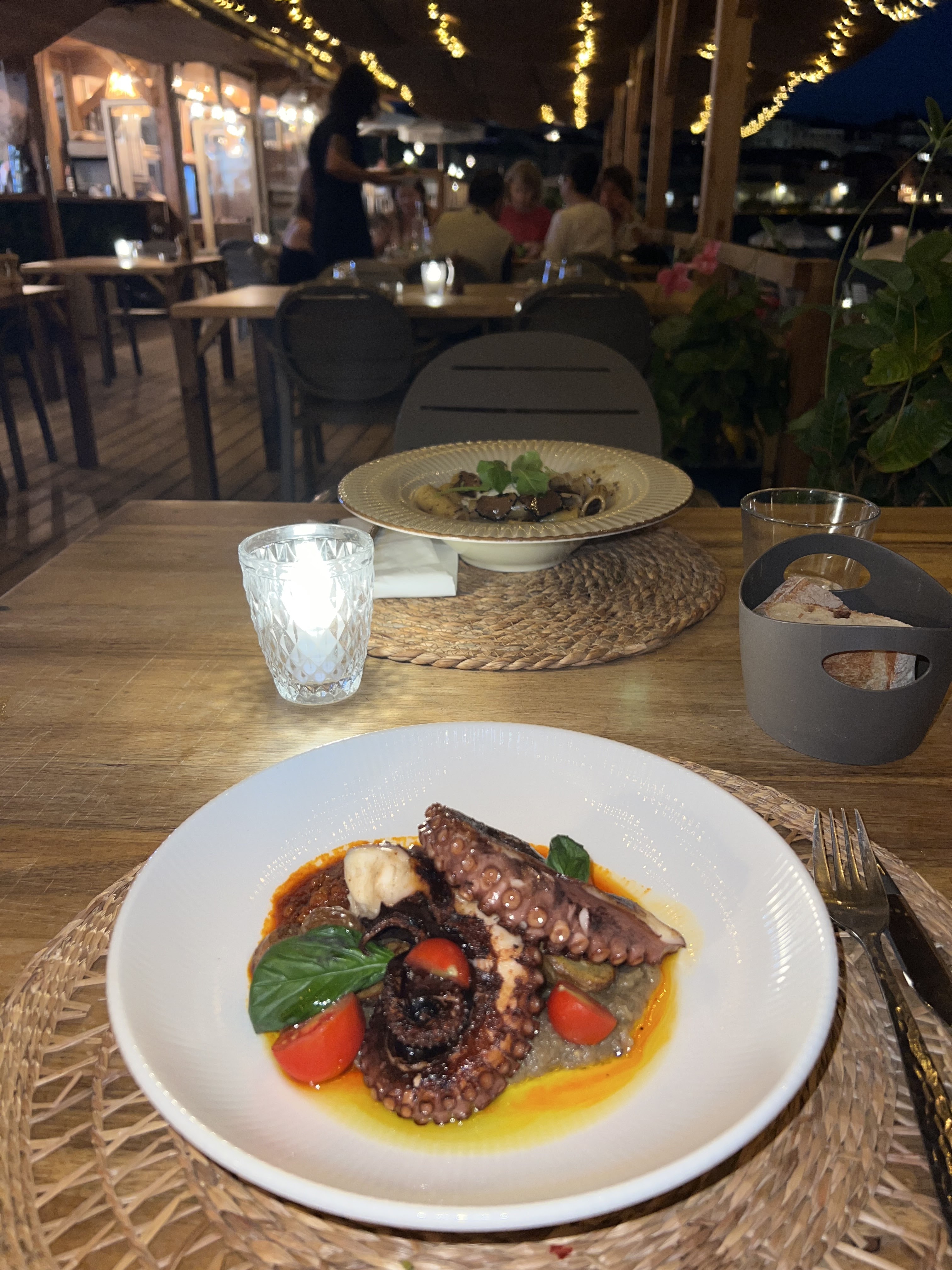 Accueil des serveuses très agréable, on a pu avoir une table au bord de l’eau sans réserver , ça c’est chouette, bon vous le direz si c’est pas complet C’est que c’est pas super! Ok mais une très bonne cuisine, nous avons pris une assiette de Buratta tomates, bon bonne mais c’est simple comme entrée donc pas d’exigence particulière, puis un croustillant de thon : alors là à se taper le c.. par terre, ce qui est dommage c’est qu’il n’y ait pas d’accompagnement avec ! Là pour le prix c’est abusé ! Et mon compagnon a pris un baba au rhum, c’était très bon aussi. A conseiller pour le cadre, vraiment manger avec le bruit des vagues… c’est trop bien à la lueur de la bougie ( artificielle) mais c’est magnifique avec les lumières de l’île Rousse . Allez y .