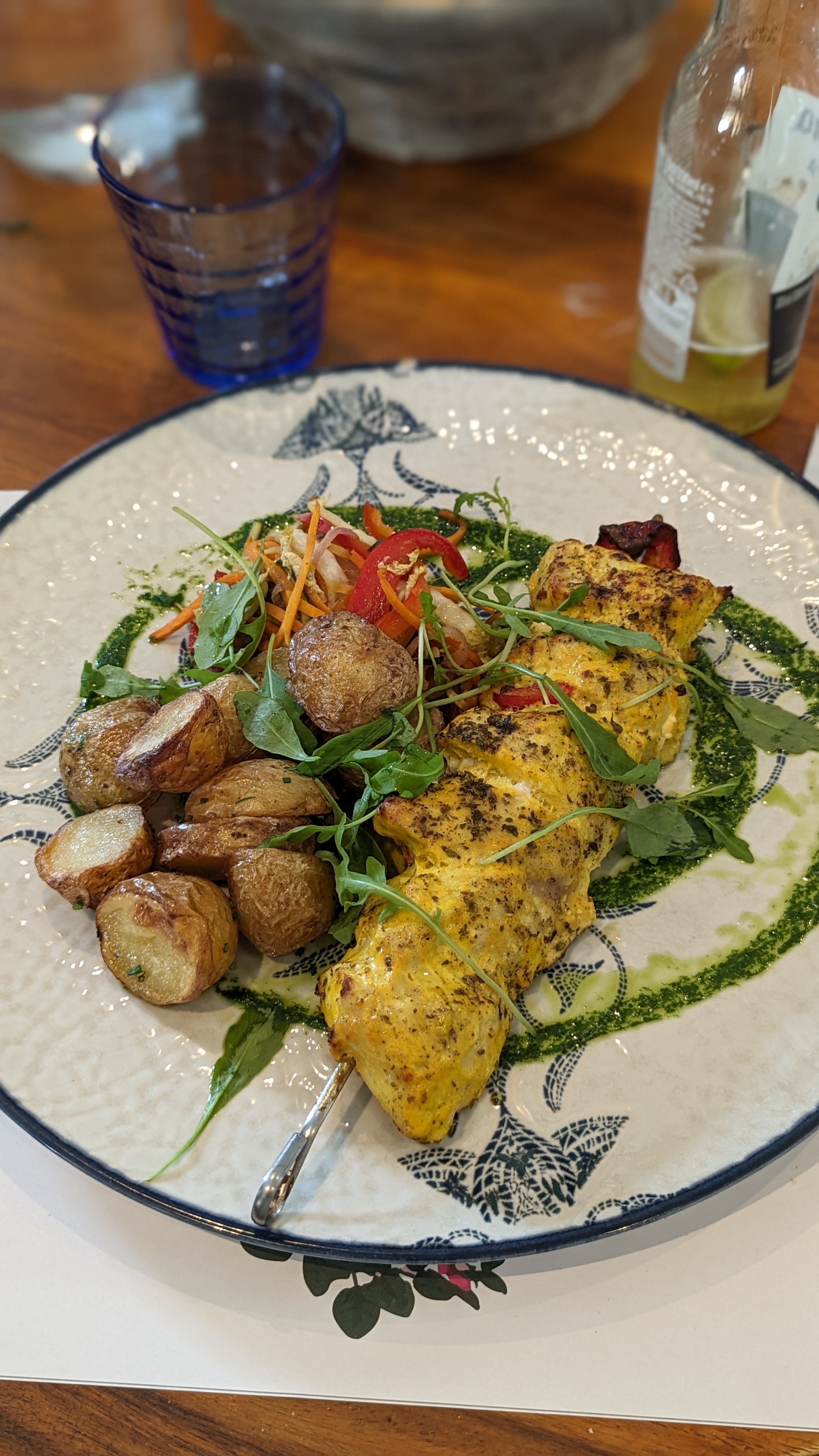La nourriture est correctement cuisinée. La promesse de la carte n’est cependant pas tenue ce qui rend le rapport qualite/prix très moyen. Le plat annoncé sur le menu avec une profusion de détails n’était qu’une brochette de poulet marinée avec quelques légumes croquants (tres peu), une pointe de yaourt grec et beaucoup de frites. Pareil pour le dessert : De l’ananas rôti avec une crème anglaise en brik et des baklavas (surement décongelés) quelconques sans saveur ( pas mauvais) avec un trait de yaourt grec. Bref pas mauvais mais pas recherché ni bien présenté. Un produit quelconque , pas cher à produire, bien magnifié par la carte, le lieu et l’ambiance. Du marketing ! On peu largement faire la même chose chez soi pour beaucoup mois cher !