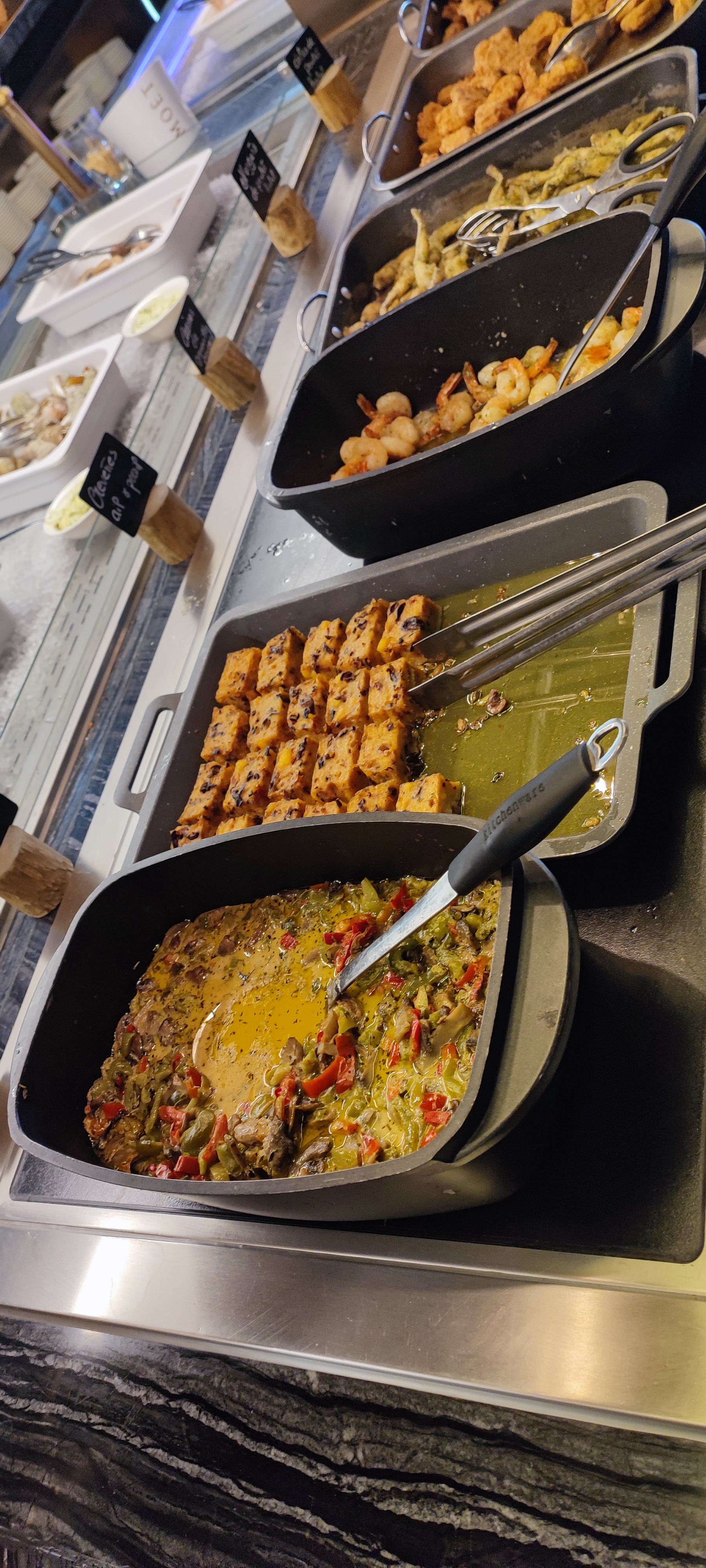 Très déçu de la cuisine. Je pense que beaucoup de ce qui est présenté ,est congelé ou acheté fini. Je suis connaisseur en fruit de mer : tous sont fades et sans goût sauf les crevettes qui sont très bonnes. La viande du carpaccio n a pas de goût de viande Les salades à par les petits oignons au vinaigre de vin sont également fades. En dessert j ai pris des fruits frais ,le seul bon était l ananas. Les pâtes sont servies avec les mains ,une petite louche serait plus appétissant . Désolé de ces remarques ,mais je ne retournerai pas dans ce restaurant