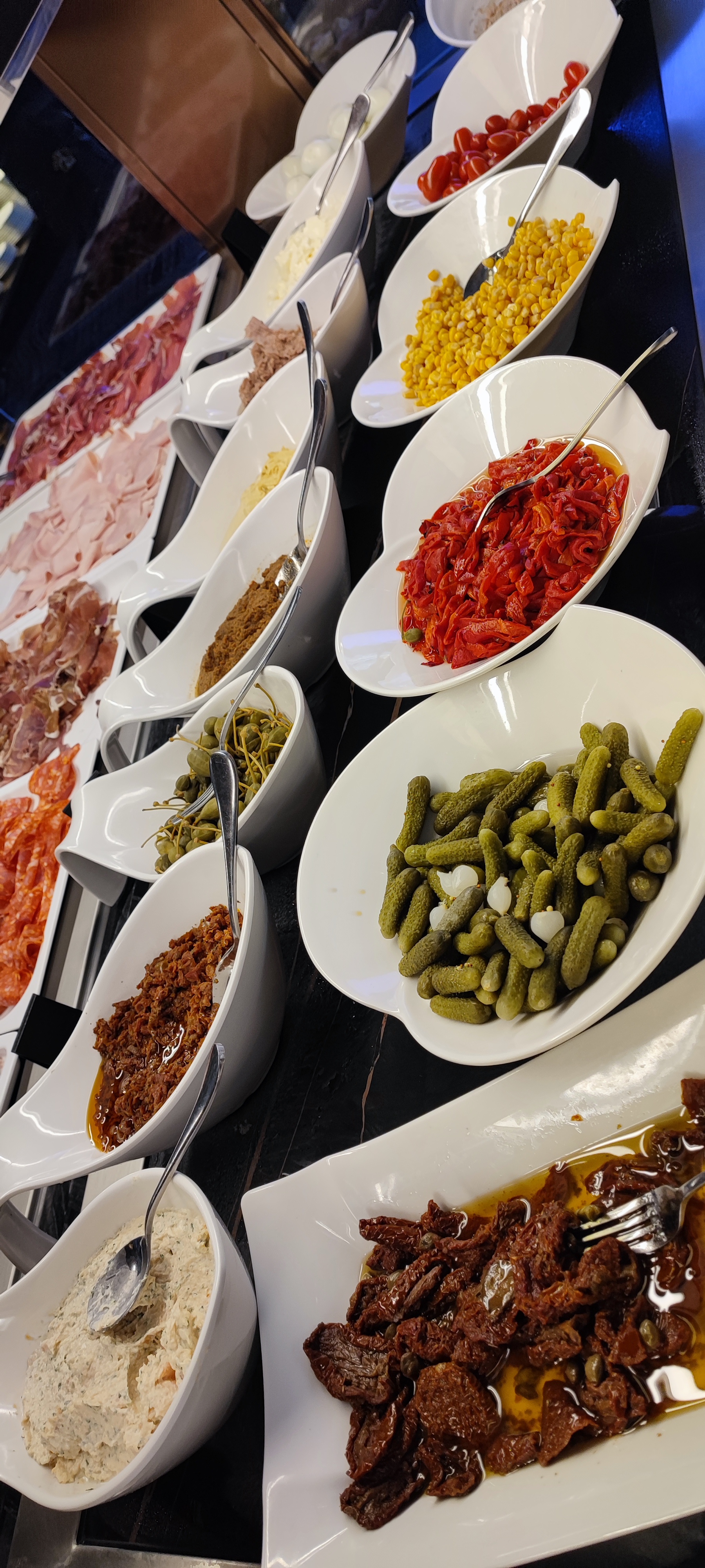 Que pourrait -on dire encore un de plus. La seule originalité, c’est des spécialités méditerranéennes. Sinon côté goût c’est fade et beaucoup de surgelés. Côté restauration c’était plutôt léger, choix restreint,peut-être parce que c’était le midi . Sinon côté satisfactions, large choix dans la charcuterie italienne et dans les fromages. Côté personnel pas très réactif dans le service et surtout dans l’approvisionnement du buffet beaucoup de manque . Point perfectible. Comme le café, goût brûlé faudrait changer la température du percolateur afin d’éviter ce goût de désagréable de brulé.