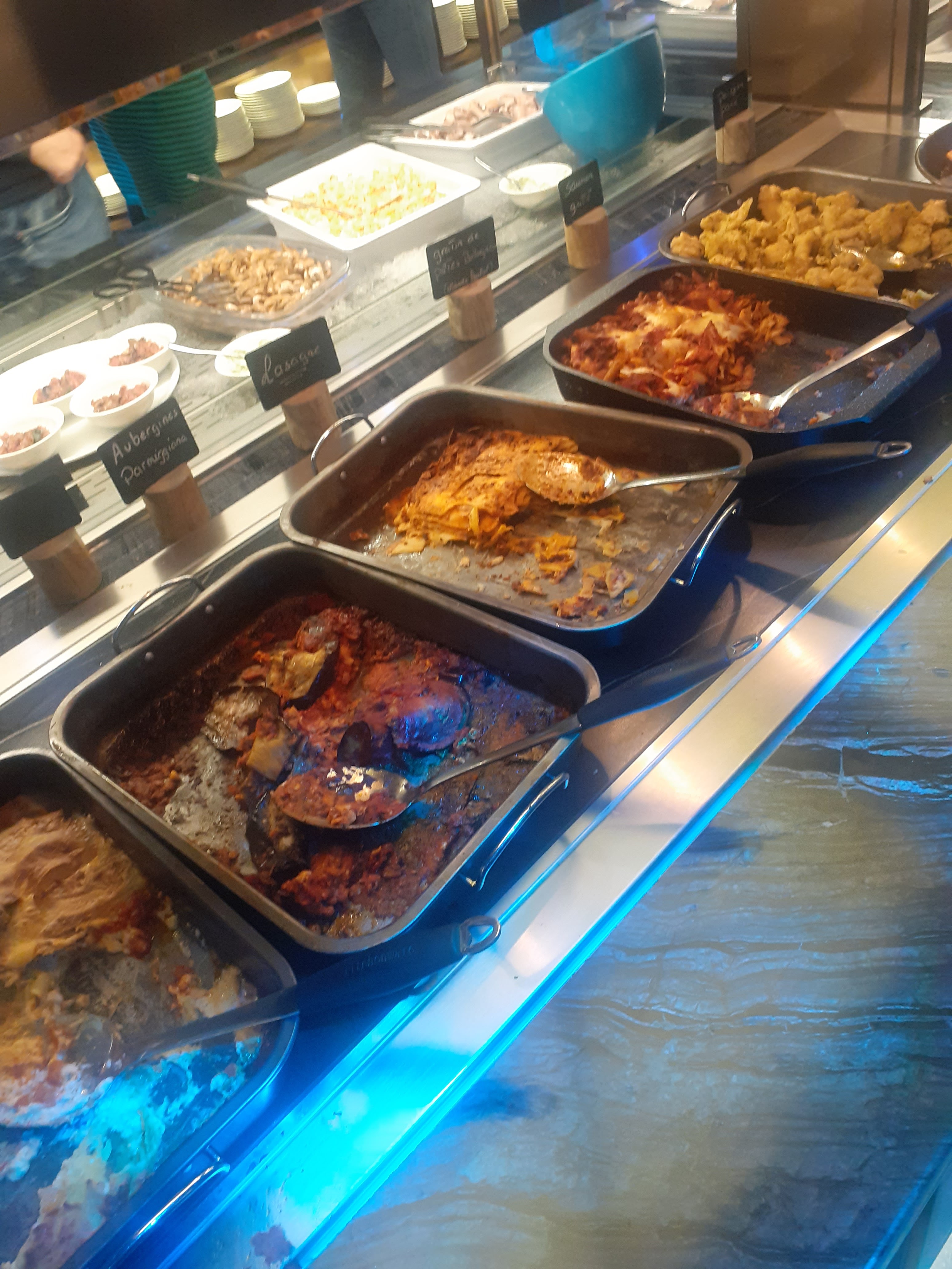 Une note globale de 2 étoiles car le service n’est pas des meilleurs. Sur le papier, le concept a l’air intéressant et plaisant. Un buffet énorme de charcuterie, les plats chaud ne le sont plus tellement et ne sont pas renouvelé tant que la dernière par de pizza soit prise ou que la dernière par de lasagne ne soit mangé. Jusque là cela paraît cohérent mais bon, fait en sorte que ça soit maintenu au chaud si vous souhaitez que l’on mange ce qu’il reste. Les saveurs ne sont pas incroyable on dirait principalement des plats surgelés réchauffé. Point positif, la décoration est original et sympa, les lieux sont propre.