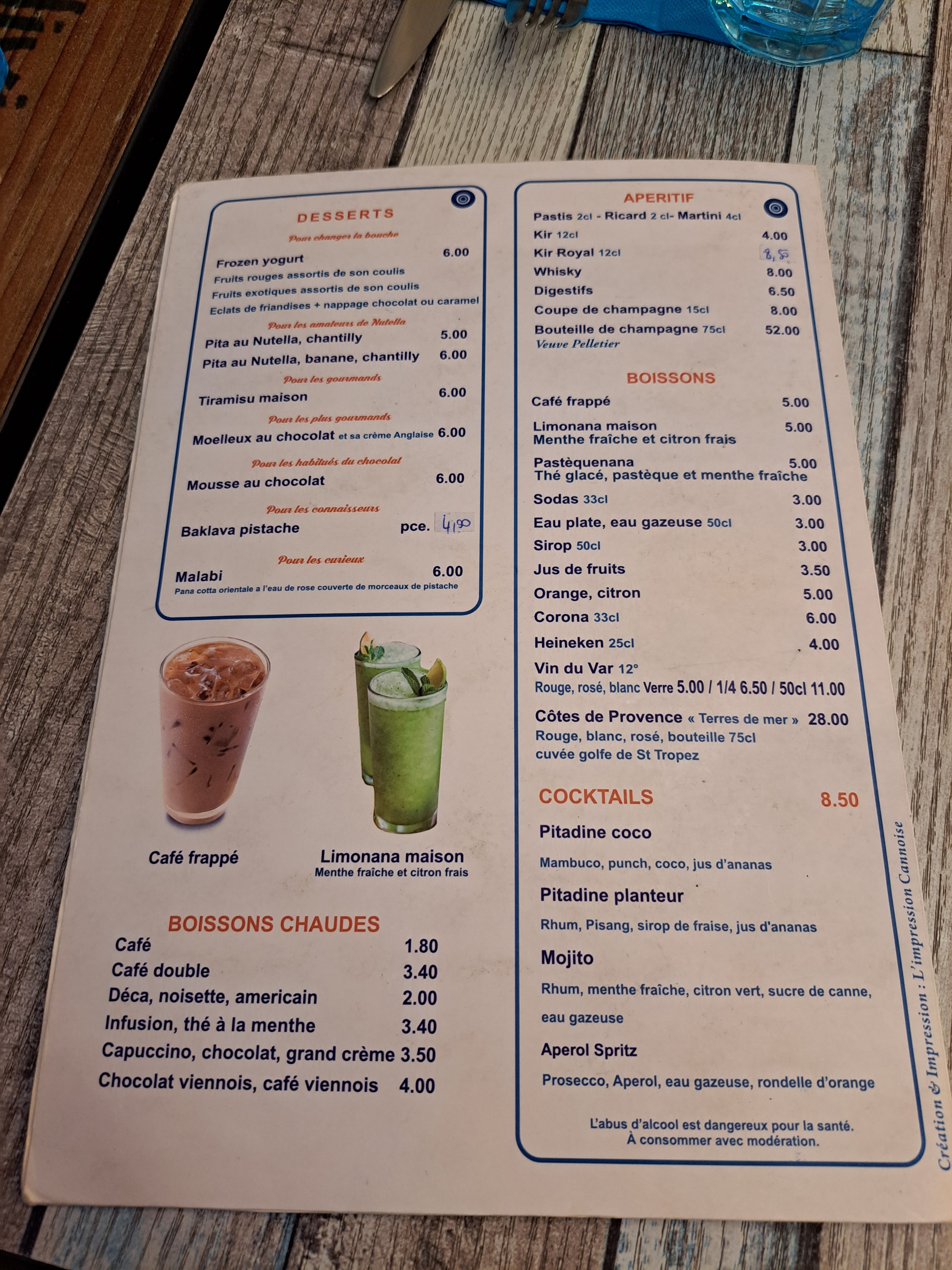 La chakchouka y est terrible, les pitas à l'assiette fraîche et copieuses le tout avec un cadre agréable (terrasse très sympa) dans le cœur de Cannes, 2mn de la gare et 2mn rue d'Antibes. Le service est agréable et rapide. Je ne peux que recommander pour une pause déjeuner pendant une journée shopping !!