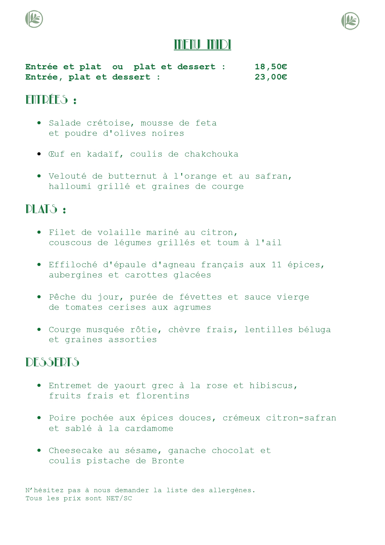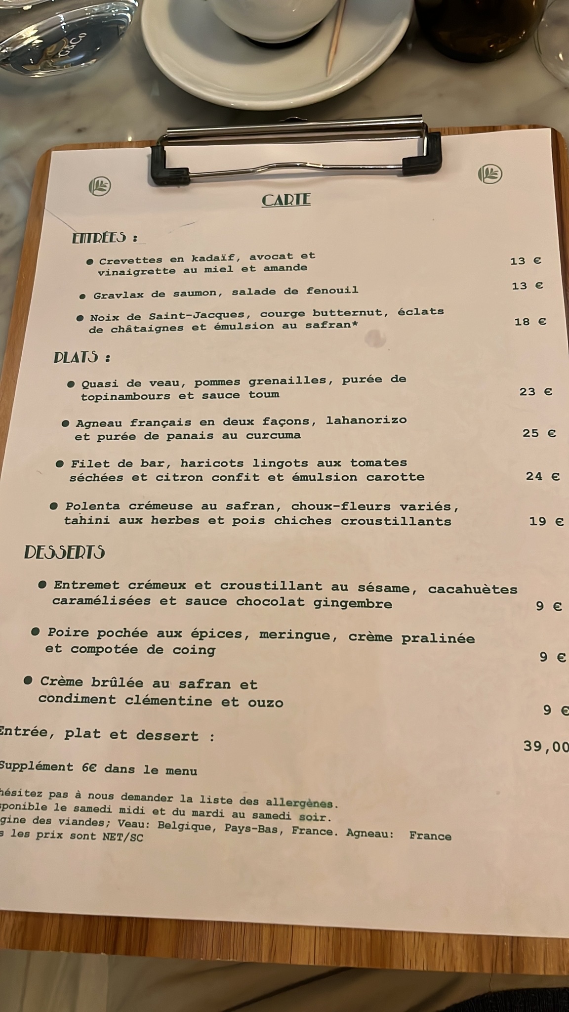 Excellent restaurant, je recommande. A savoir : l'entrée + plat ou plat + dessert est à 18,50€ et entrée + plat + dessert à 23,50€. Le décor est très sympathique et l'accueil chaleureux.