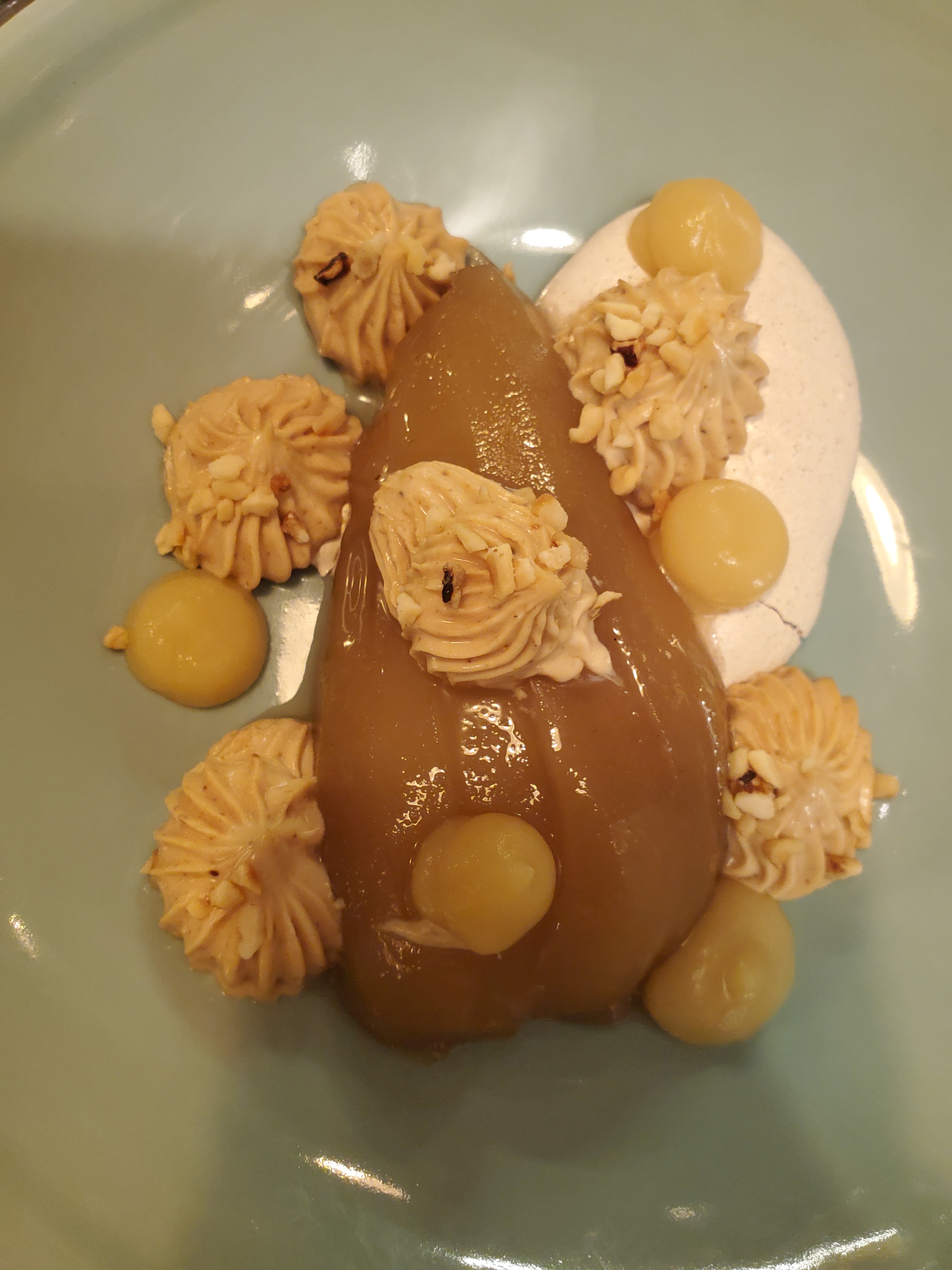 Nous avons choisi le poisson du jour et nous n’avons pas été convaincu par les haricots blancs associés Par contre le dessert avec la poire pochée dessert excellent