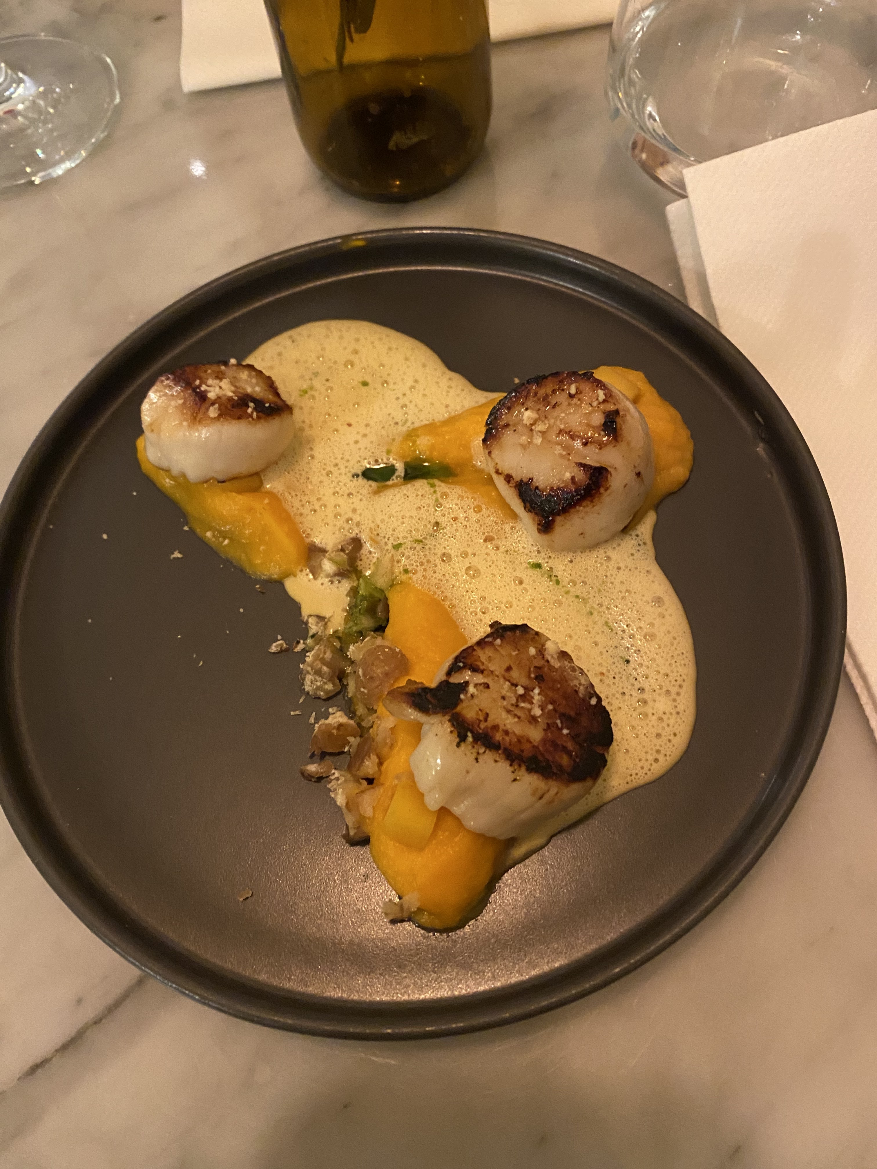 Mon amie venait pour la première fois et elle a bien aimé le cadre et la tranquillité des lieux. Nous avions toutes les deux pris les saint Jacques. La préparation était recherchée et nous les avons appréciées. Pour les desserts, nous sommes d’accord pour dire que les noms étaient plus prometteurs que les desserts eux-mêmes. Merci 🙏🏼