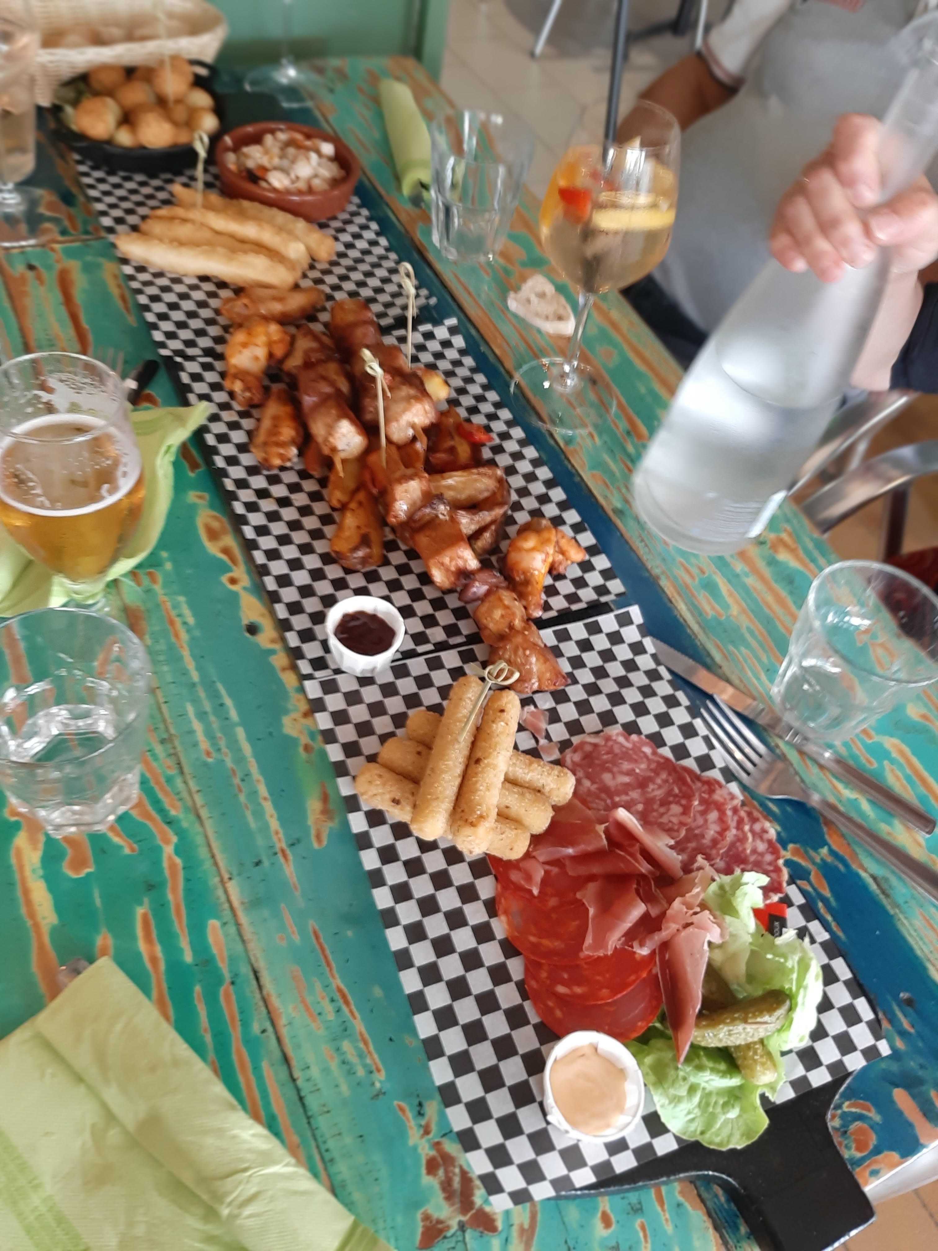 Ne sachant pas où manger ce jour nous avons choisi ce restaurant mais franchement trop déçu. Les enfants commandent un sirop l eau ce sont des diabolos qui ont été servi. Le serveur prend à peine son service qu il est déjà surmené. Menu solo commandé tenders par cuits . Plat de tapas pour 3 entre terre et mer et bien franchement à revoir. J en ai déjà mal au bid. Bref je ne le recommande pas du tout. De plus les tables sont hyper collantes selon le serveur c est du au vernis .