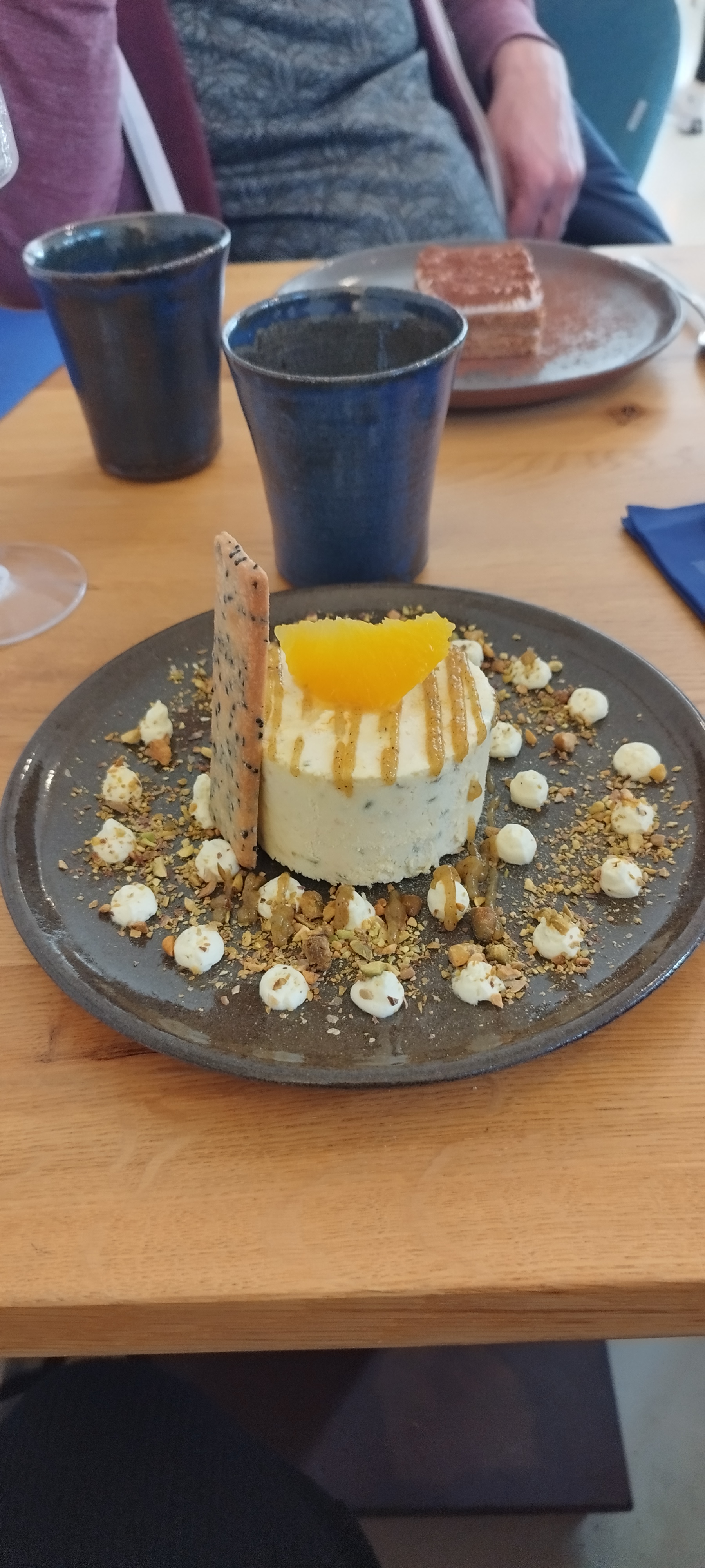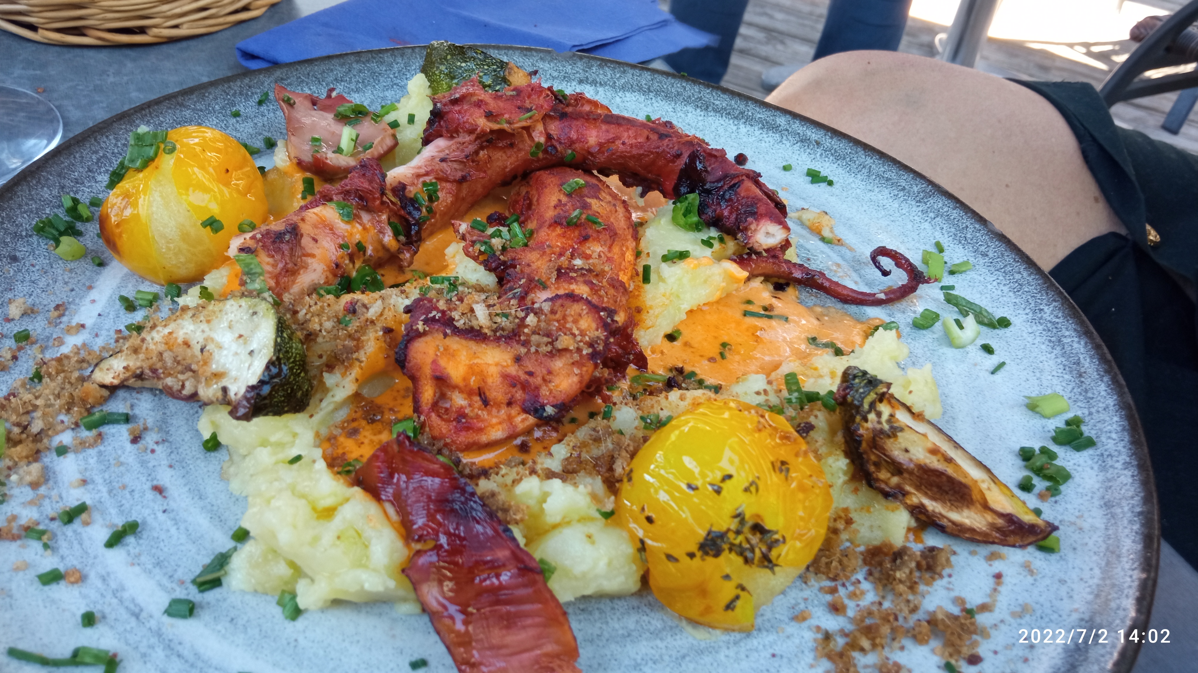 Nous nous sommes installés à table à 19:30, entre un americano en apéro qui avait plus un goût deau, servi avec un seul glaçon, assiette de poulpe à 25€ (2 tentacules sur une purée, sans légumes, rien à voir avec la photo du site) et un dessert du jour (prix non affiché) à un tarif de 12€. On a eu l'impression d'avoir été oublié par la serveuse, peut-être les étrangers passent après les autres 🤔, sorties de table à 21:45, un peu long vu que d'autres tables arrivées après ont fini avant nous.